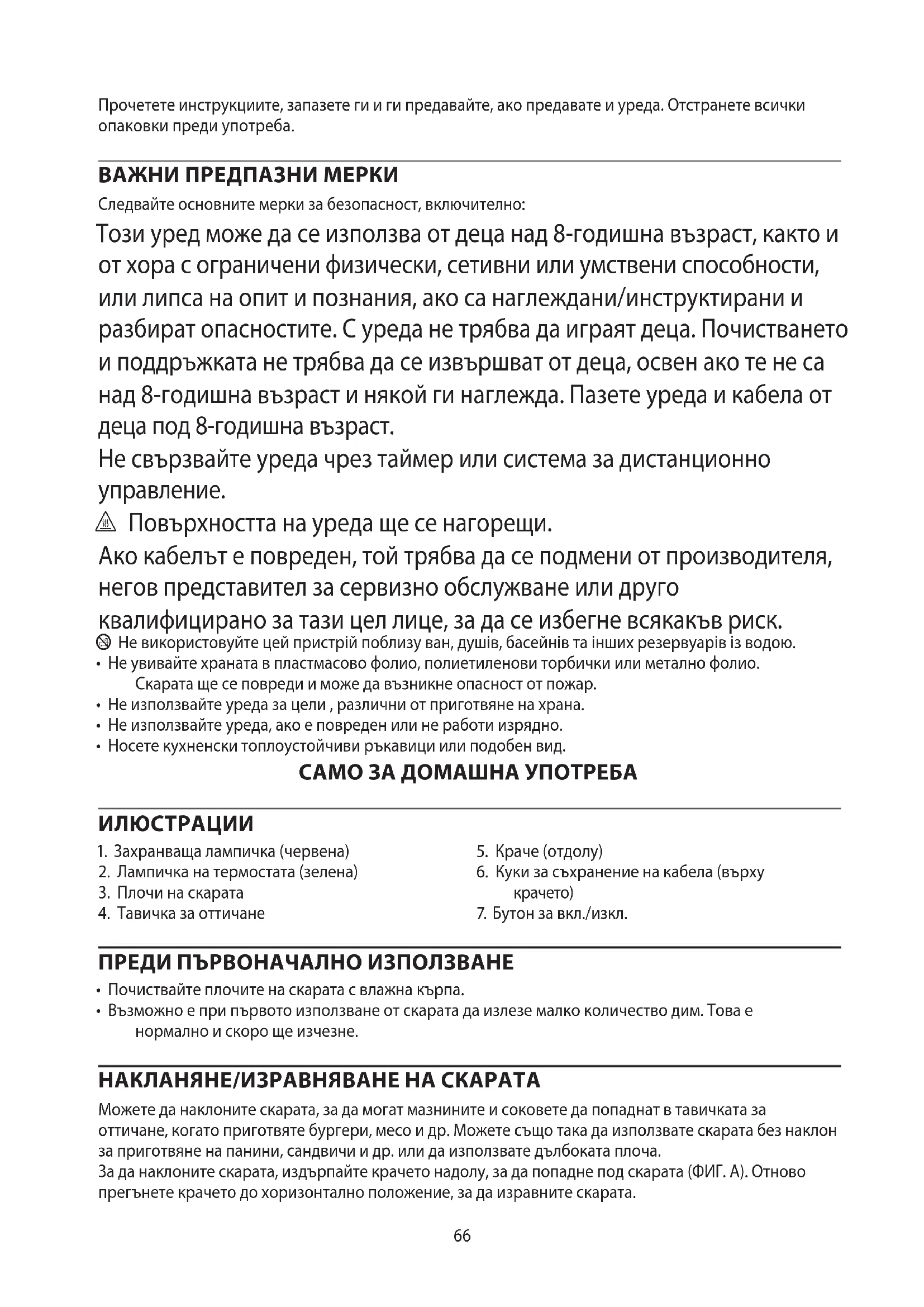 AE66 Прочетете инструкциите, запазете ги и ги предавайте, ако предавате и уреда. Отстранете всички опаковки преди употреба. ВАЖНИ ПРЕДПАЗНИ МЕРКИ Следвайте основните мерки за безопасност, включително: Този уред може да се използва от деца над 8-годишна възраст, както и от хора с ограничени физически, сетивни или умствени способности, или липса на опит и познания, ако са наглеждани/инструктирани и разбират опасностите. С уреда не трябва да играят деца. Почистването и поддръжката не трябва да се извършват от деца, освен ако те не са над 8-годишна възраст и някой ги наглежда. Пазете уреда и кабела от деца под 8-годишна възраст. Не свързвайте уреда чрез таймер или система за дистанционно управление. ¬ Повърхността на уреда ще се нагорещи. Ако кабелът е повреден, той трябва да се подмени от производителя, негов представител за сервизно обслужване или друго квалифицирано за тази цел лице, за да се избегне всякакъв риск. b Не використовуйте цей пристрій поблизу ван, душів, басейнів та інших резервуарів із водою.