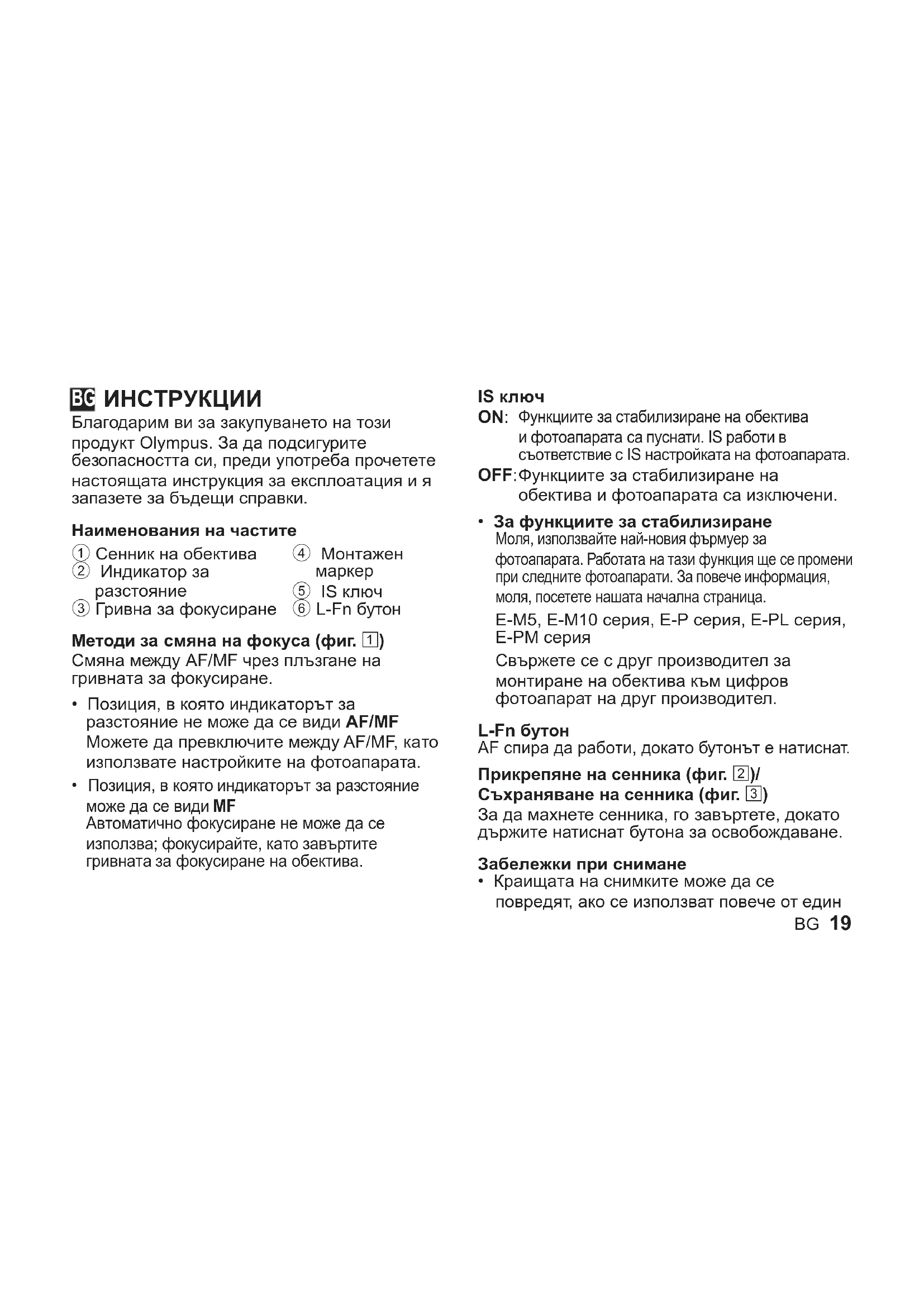 - За функциите за стабилизиране Моля, използвайте най-новия фърмуер за фотоапарата. Работата на тази функция ще се промени при следните фотоапарати. За повече информация, моля, посетете нашата начална страница. E-M5, E-M10 серия, E-P серия, E-PL серия, E-PM серия Свържете се с друг производител за монтиране на обектива към цифров фотоапарат на друг производител. L-Fn бутон AF спира да работи, докато бутонът е натиснат. Прикрепяне на сенника (фиг. 2)/ Съхраняване на сенника (фиг. 3) За да махнете сенника, го завъртете, докато държите натиснат бутона за освобождаване. Забележки при снимане
