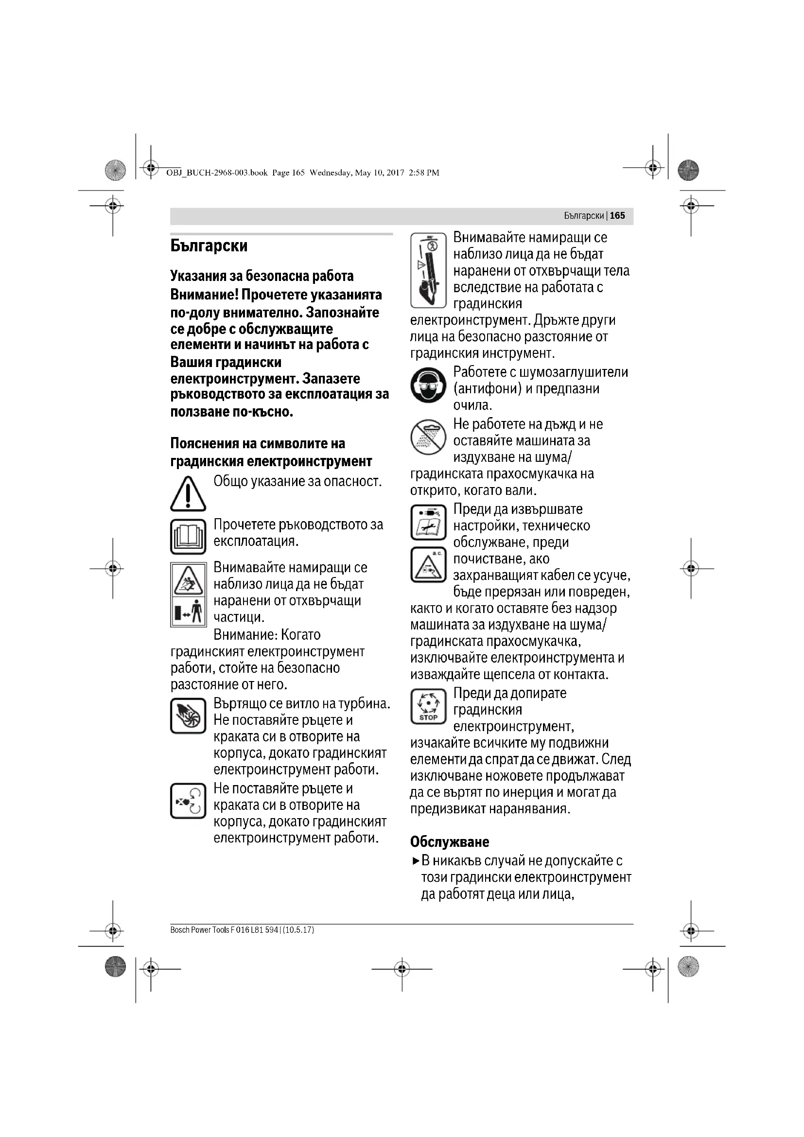 OBJ_BUCH-2968-003.book Page 172 Wednesday, May 10, 2017 2:58 PMМакедонски | 173 Bosch Power Tools F 016 L81 594 | (10.5.17) Поддържане и сервиз Поддържане, почистване и съхраняване Преди извършване на каквито и да е дейности по градинския електроинструмент изключвайте щепсела от контакта. За да работите качествено и сигурно, поддържайте градинския електроинструмент чист. За да работите качествено и сигурно, поддържайте градинския електроинструмент и вентилационните отвори чисти. Отстранявайте замърсявания от градинския електроинструмент или торбата за отпадъци с влажна