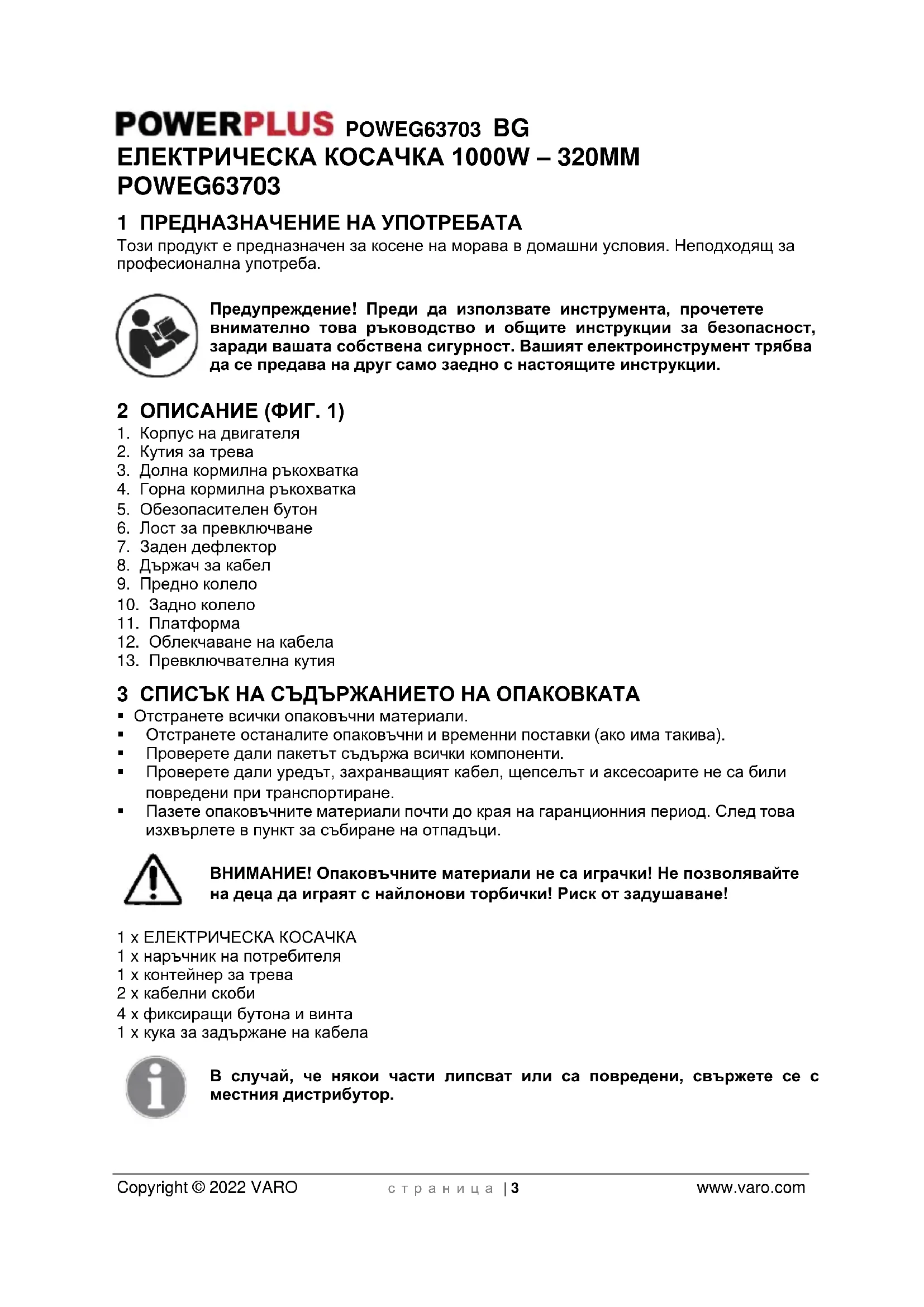 - В никакъв случай не работете с машината, ако протекторите или защитните екрани, например отклоняващите протектори и/или уловителите на трева, са дефектни или липсват.POWEG63703 BG Copyright © 2022 VARO с т р а н и ц а | 8 www.varo.com