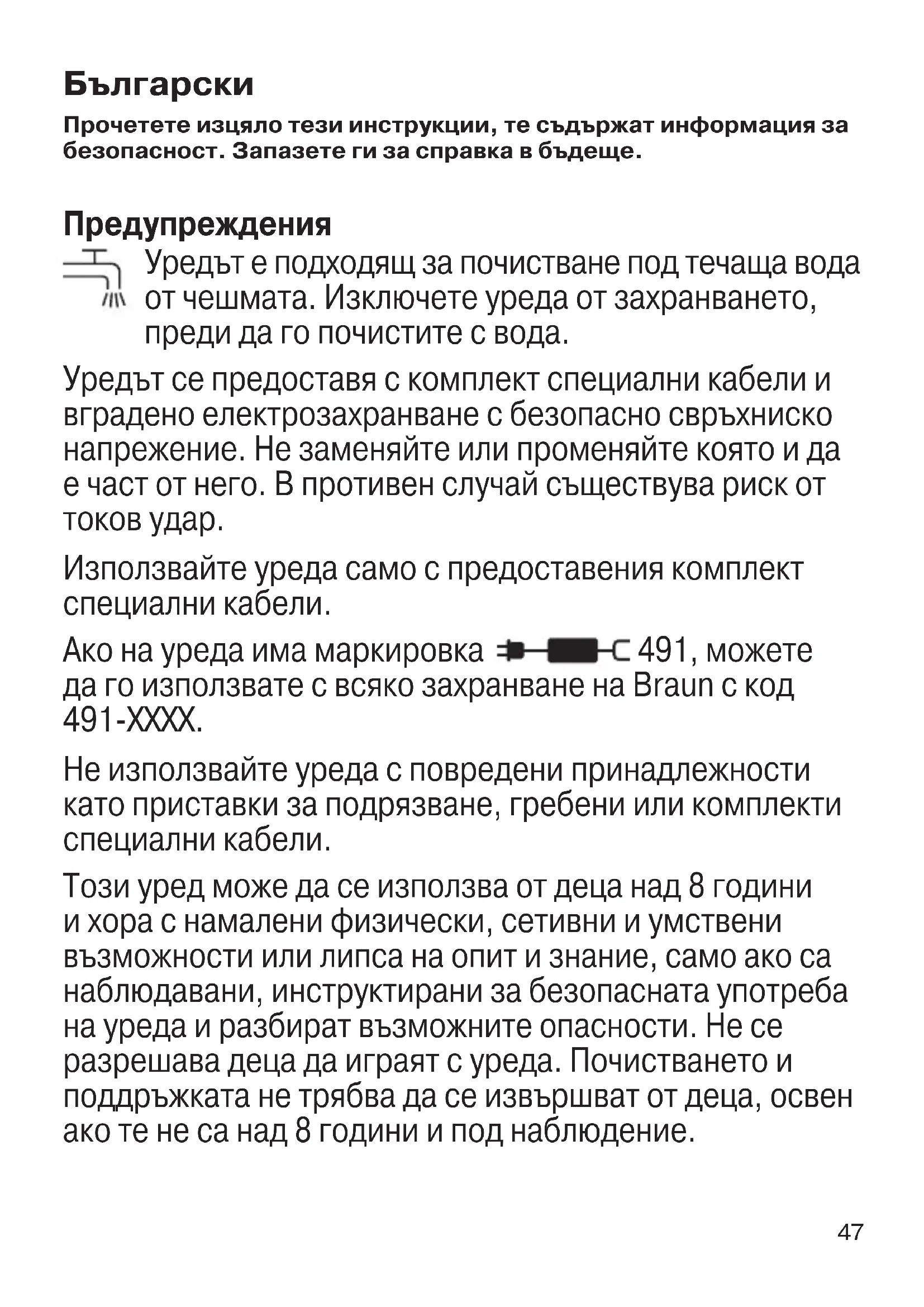 Прочетете изцяло тези инструкции, те съдържат информация за безопасност. Запазете ги за справка в бъдеще. Предупреждения Уредът е подходящ за почистване под течаща вода от чешмата. Изключете уреда от захранването, преди да го почистите с вода. Уредът се предоставя с комплект специални кабели и вградено електрозахранване с безопасно свръхниско напрежение. Не заменяйте или променяйте която и да е част от него. В противен случай съществува риск от токов удар. Използвайте уреда само с предоставения комплект специални кабели. Ако на уреда има маркировка 491, можете да го използвате с всяко захранване на Braun с код 491-XXXX. Не използвайте уреда с повредени принадлежности като приставки за подрязване, гребени или комплекти специални кабели. Този уред може да се използва от деца над 8 години и хора с намалени физически, сетивни и умствени възможности или липса на опит и знание, само ако са наблюдавани, инструктирани за безопасната употреба на уреда и разбират възможните опасности. Не се разрешава деца да играят с уреда. Почистването и поддръжката не трябва да се извършват от деца, освен ако те не са над 8 години и под наблюдение. 91390847_MGK_3040-3045-3060_CEEMEA.indd 4791390847_MGK_3040-3045-3060_CEEMEA.indd 47 20.03.17 11:1320.03.17 11:13 CSS APPROVED Effective Date 24Mar2017 GMT - Printed 05Apr2017 Page 47 of 6848