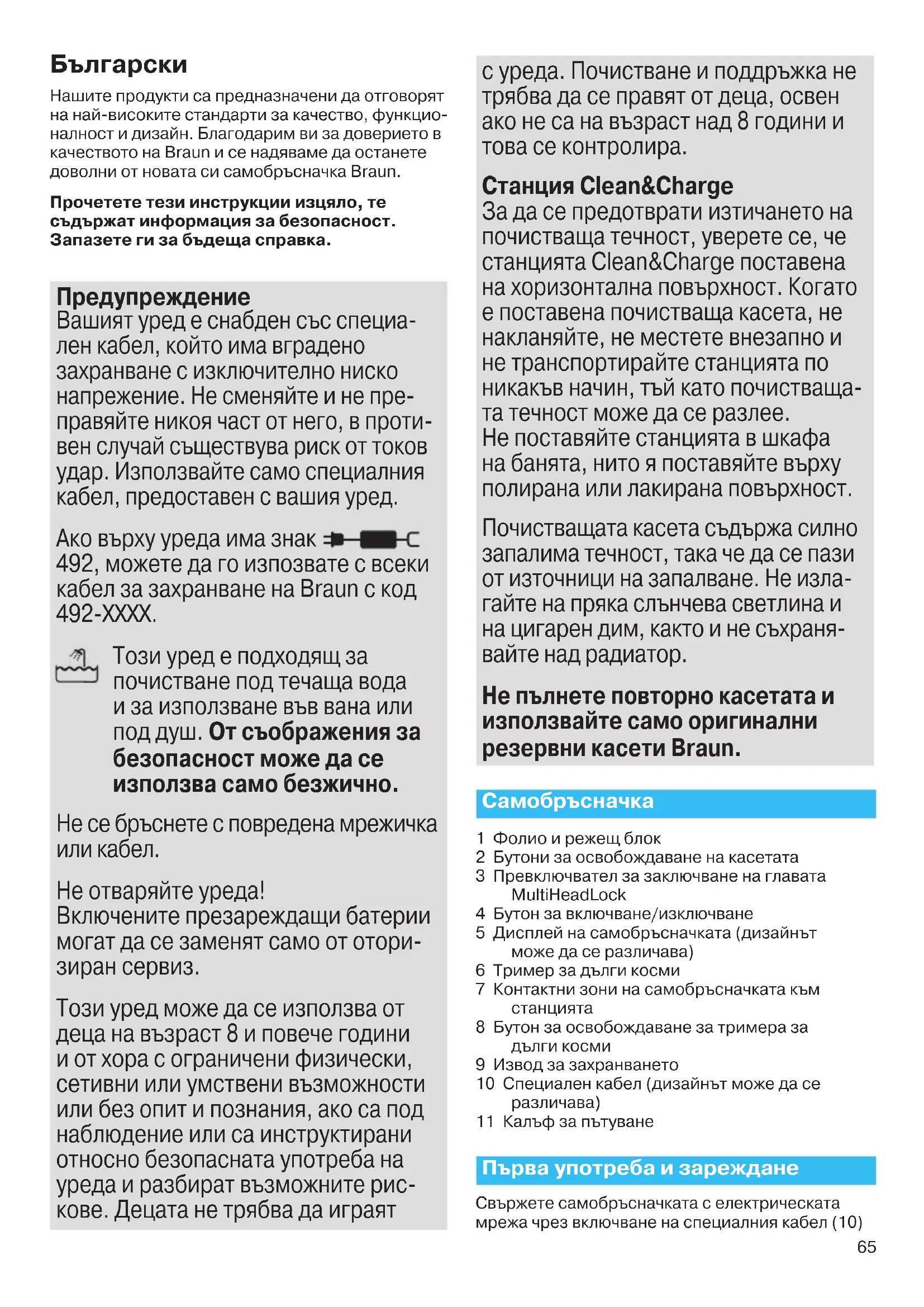 Нашите продукти са предназначени да отговорят на най-високите стандарти за качество, функцио- налност и дизайн. Благодарим ви за доверието в качеството на Braun и се надяваме да останете доволни от новата си самобръсначка Braun. Прочетете тези инструкции изцяло, те съдържат информация за безопасност. Запазете ги за бъдеща справка. Предупреждение Вашият уред е снабден със специа- лен кабел, който има вградено захранване с изключително ниско напрежение. Не сменяйте и не пре- правяйте никоя част от него, в проти- вен случай съществува риск от токов удар. Използвайте само специалния кабел, предоставен с вашия уред. Ако върху уреда има знак 492, можете да го изпозвате с всеки кабел за захранване на Braun с код 492-ХХХХ. Този уред е подходящ за почистване под течаща вода и за използване във вана или под душ. От съображения за безопасност може да се използва само безжично. Не се бръснете с повредена мрежичка