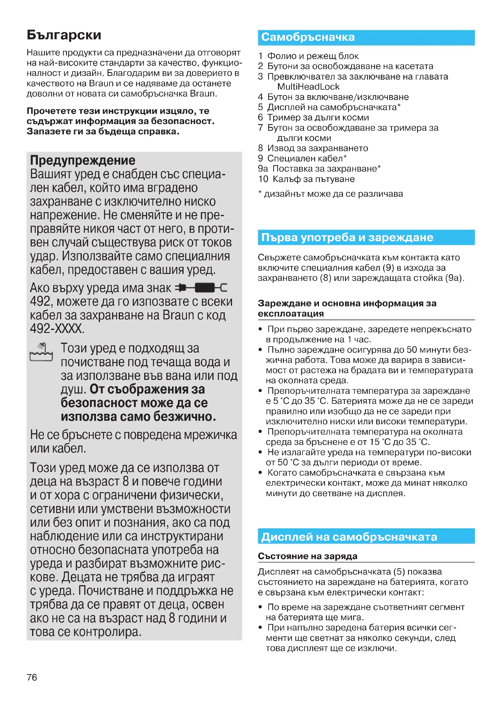 Нашите продукти са предназначени да отговорят на най-високите стандарти за качество, функцио- налност и дизайн. Благодарим ви за доверието в качеството на Braun и се надяваме да останете доволни от новата си самобръсначка Braun. Прочетете тези инструкции изцяло, те съдържат информация за безопасност. Запазете ги за бъдеща справка. Предупреждение Вашият уред е снабден със специа- лен кабел, който има вградено захранване с изключително ниско напрежение. Не сменяйте и не пре- правяйте никоя част от него, в проти- вен случай съществува риск от токов удар. Използвайте само специалния кабел, предоставен с вашия уред. Ако върху уреда има знак 492, можете да го изпозвате с всеки кабел за захранване на Braun с код 492-ХХХХ. Този уред е подходящ за почистване под течаща вода и за използване във вана или под душ. От съображения за безопасност може да се използва само безжично. Не се бръснете с повредена мрежичка