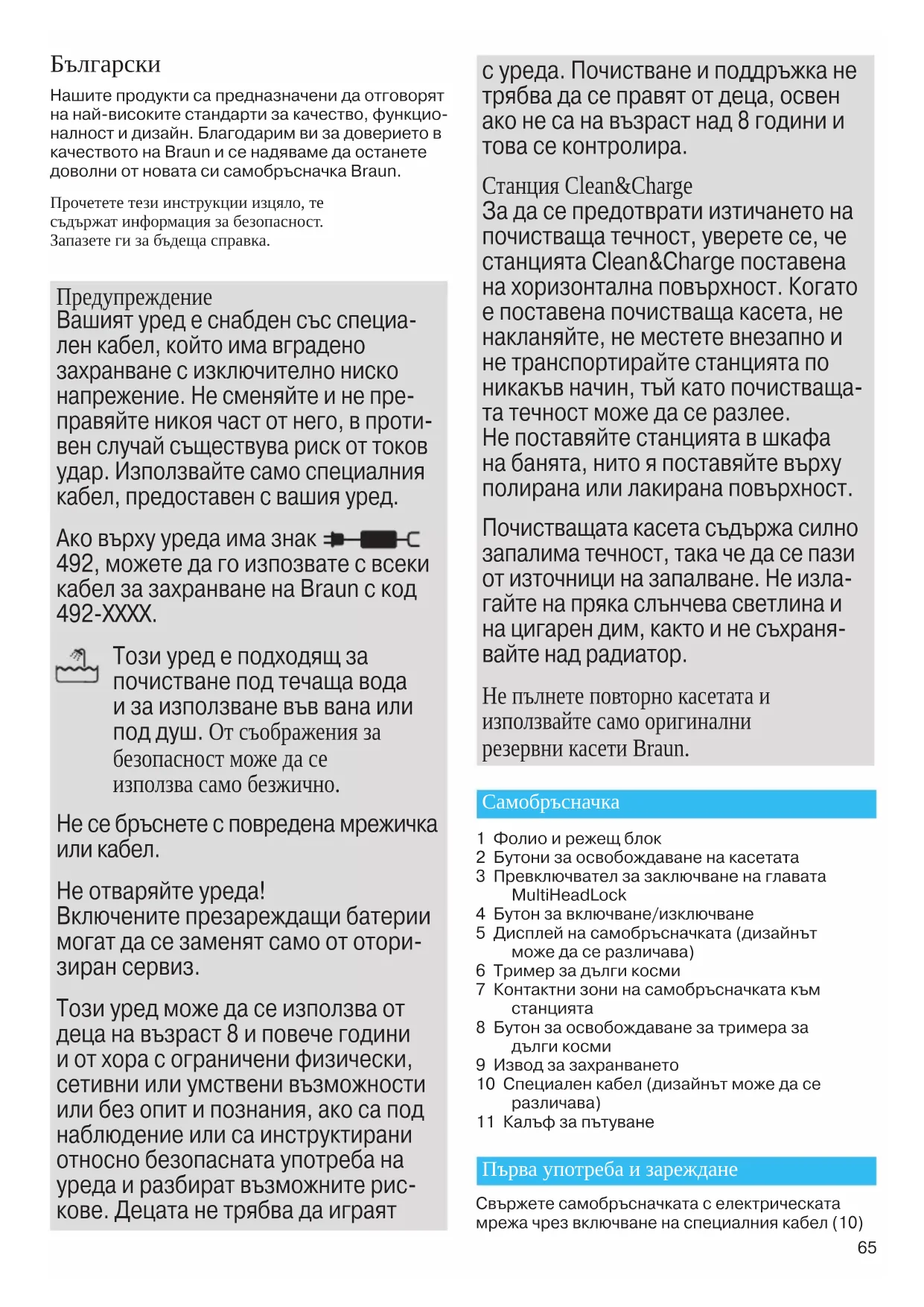 Нашите продукти са предназначени да отговорят на най-високите стандарти за качество, функцио- налност и дизайн. Благодарим ви за доверието в качеството на Braun и се надяваме да останете доволни от новата си самобръсначка Braun. Прочетете тези инструкции изцяло, те съдържат информация за безопасност. Запазете ги за бъдеща справка. Предупреждение Вашият уред е снабден със специа- лен кабел, който има вградено захранване с изключително ниско напрежение. Не сменяйте и не пре- правяйте никоя част от него, в проти- вен случай съществува риск от токов удар. Използвайте само специалния кабел, предоставен с вашия уред. Ако върху уреда има знак 492, можете да го изпозвате с всеки кабел за захранване на Braun с код 492-ХХХХ. Този уред е подходящ за почистване под течаща вода и за използване във вана или под душ. От съображения за безопасност може да се използва само безжично. Не се бръснете с повредена мрежичка
