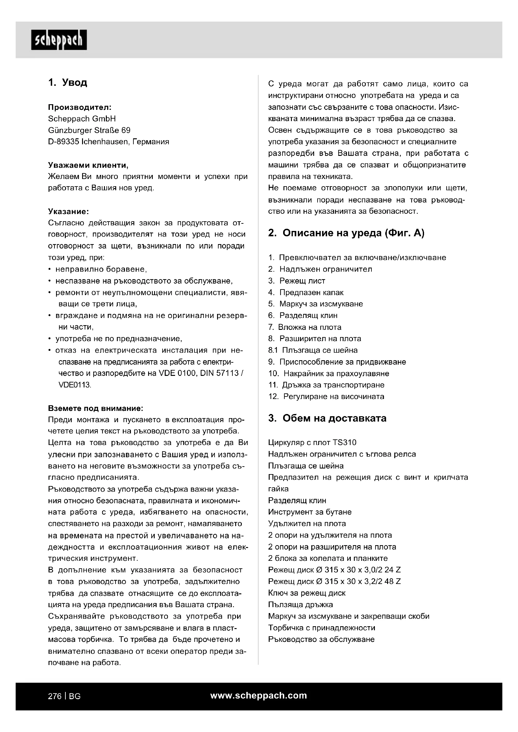 РЪКОВОДСТВО ЗА ПОТРЕБИТЕЛЯ TS310 SCHEPPACH