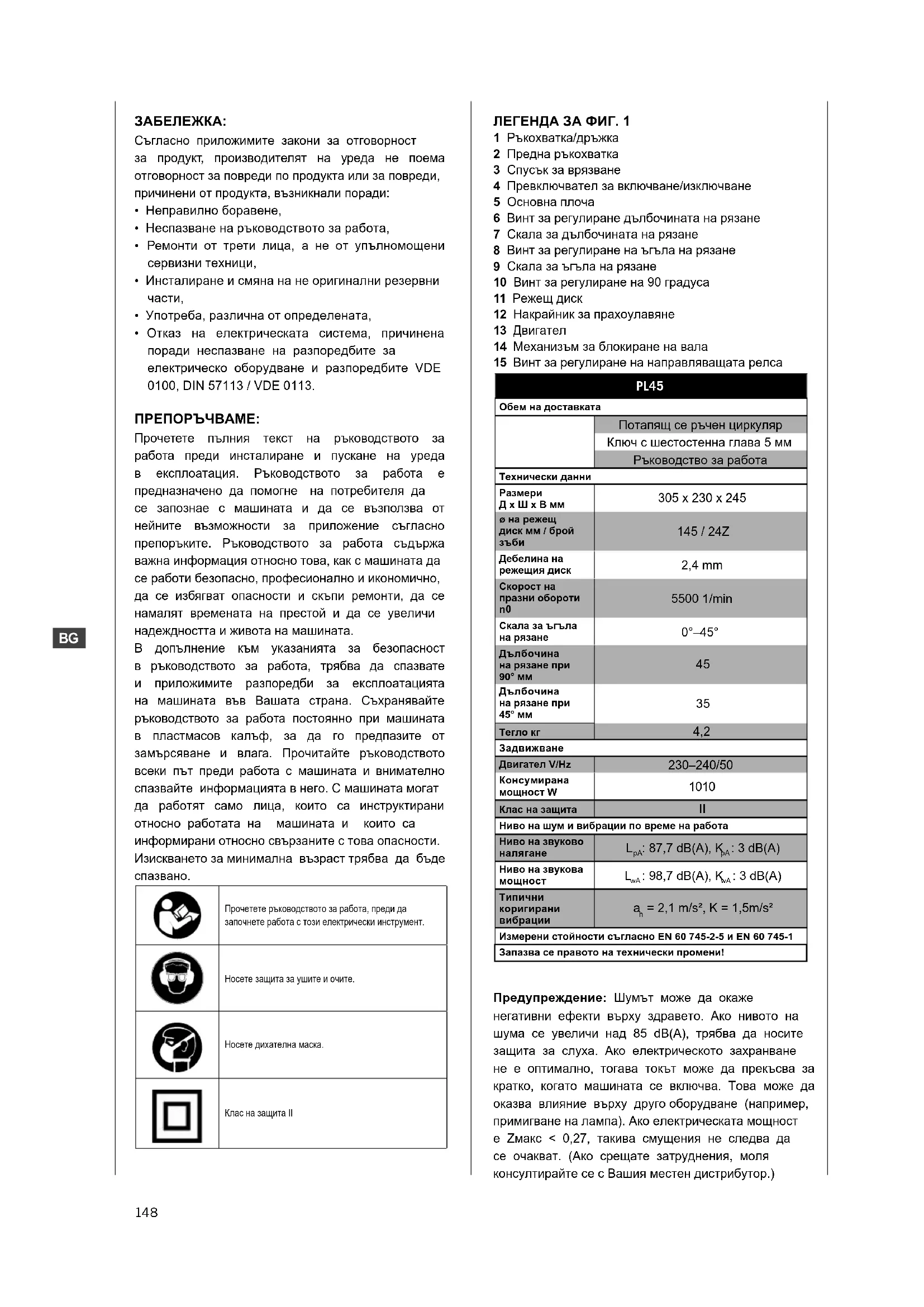 ЛЕГЕНДА ЗА ФИГ. 1 1 Ръкохватка/дръжка 2 Предна ръкохватка 3 Спусък за врязване 4 Превключвател за включване/изключване 5 Основна плоча 6 Винт за регулиране дълбочината на рязане 7 Скала за дълбочината на рязане 8 Винт за регулиране на ъгъла на рязане 9 Скала за ъгъла на рязане 10 Винт за регулиране на 90 градуса 11 Режещ диск 12 Накрайник за прахоулавяне 13 Двигател 14 Механизъм за блокиране на вала 15 Винт за регулиране на направляващата релса PL45 Обем на доставката Потапящ се ръчен циркуляр Ключ с шестостенна глава 5 мм Ръководство за работа Технически данни