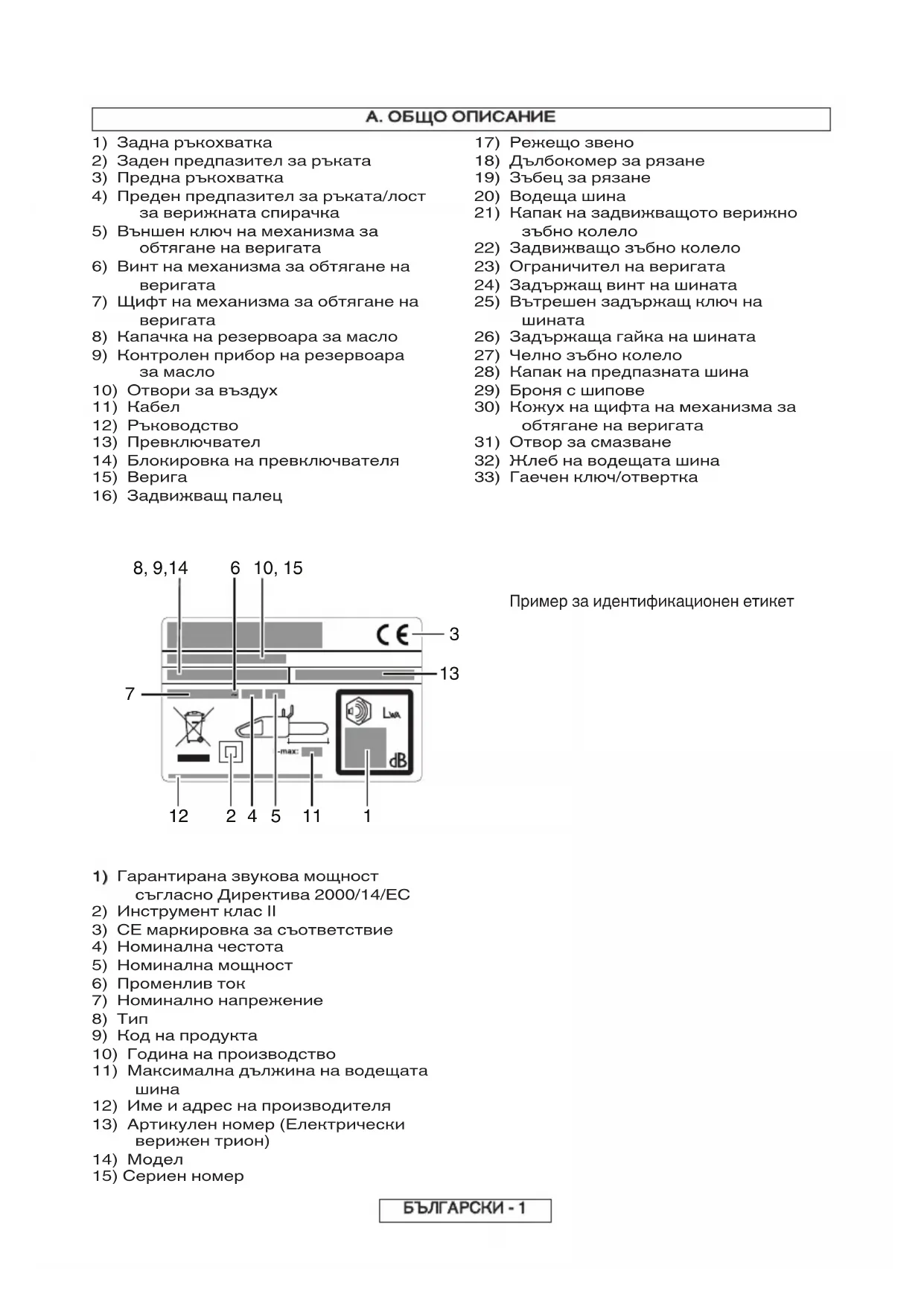Следвайте инструкциите на производителя за заточване и поддръжка на верижния трион. Намаляване на височината на дълбокомера може да доведе до повишено отскачане назад. Допълнителни препоръки за безопасност БЪЛГАРСКИ - 31. Ръчна употреба Всички лица, които ще използват този инструмент, трябва да прочетат изцяло и изключително внимателно наръчника на потребителя. Наръчникът на потребителя трябва да присъства в опаковката, с която се продава инструментът, или да се предоставя на друго лице при ползването му.