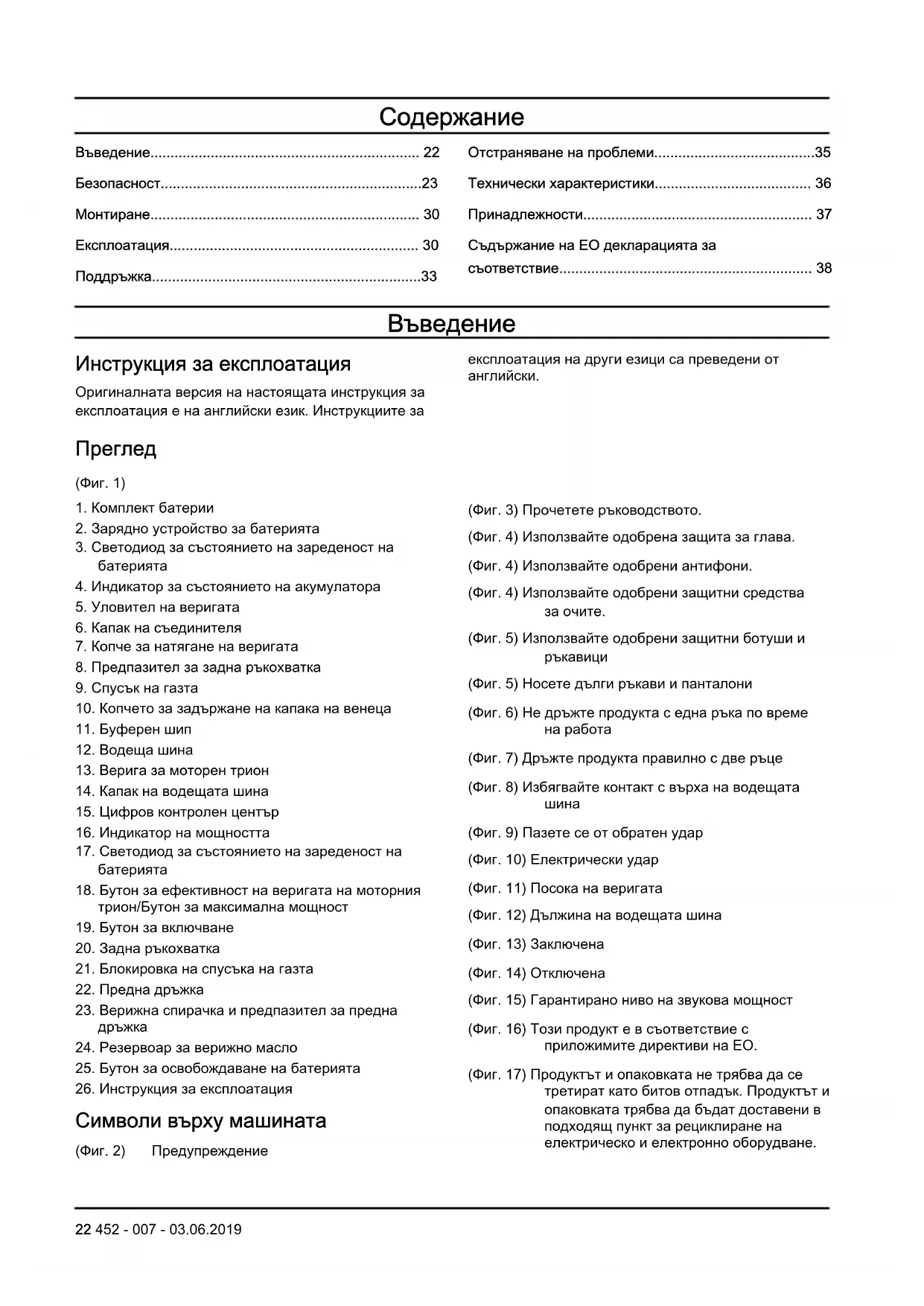 (Фиг. 9) Пазете се от обратен удар (Фиг. 10) Електрически удар (Фиг. 11) Посока на веригата (Фиг. 12) Дължина на водещата шина (Фиг. 13) Заключена (Фиг. 14) Отключена (Фиг. 15) Гарантирано ниво на звукова мощност (Фиг. 16) Този продукт е в съответствие с приложимите директиви на EO. (Фиг. 17) Продуктът и опаковката не трябва да се третират като битов отпадък. Продуктът и опаковката трябва да бъдат доставени в подходящ пункт за рециклиране на електрическо и електронно оборудване. 22 452 - 007 - 03.06.2019(Фиг. 18) Не оставяйте, не съхранявайте и не използвайте в условия на дъжд или