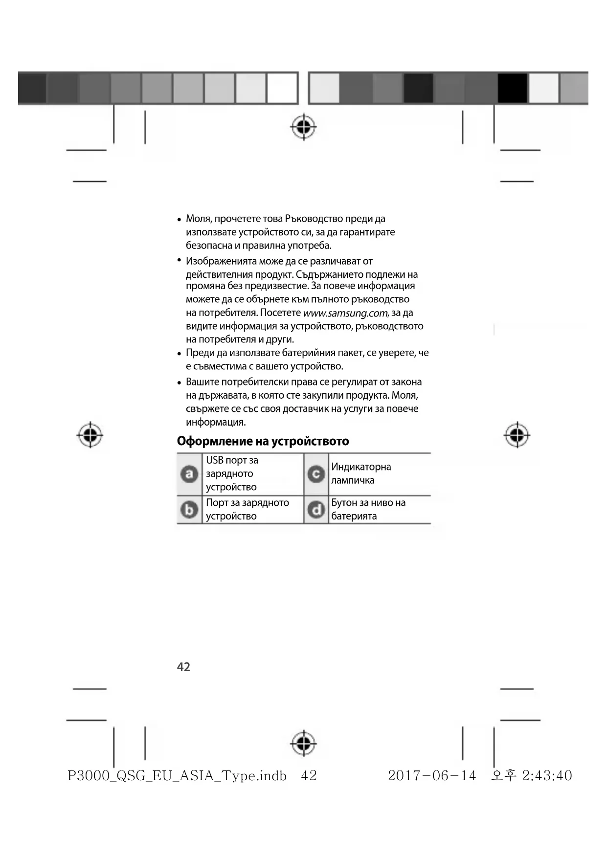 Информация за безопасност Прочетете цялата информация за безопасност, преди да използвате устройството, за да осигурите безопасна и правилна употреба. За да видите пълната информация за безопасност, идете до уебсайта на Samsung. Използвайте батерии, зарядни устройства, аксесоари и резервни части, одобрени от производителя Не докосвайте устройството с мокри ръце Не изпускайте или подлагайте зарядното устройство на удар Устройството може да се използва на места с температура на околна среда между 0°C до 35°C. Можете да съхранявате устройството при температура на околната среда между -20°C до 50°C. Използването или съхраняването на устройството извън препоръчаните температурни диапазони може да повреди устройството или да намали живота на батерията Предотвратете контакта на многофункционалния жак и малкия край на зарядното устройство с проводими материали като течности, прах, метален прах и графит на моливи Не позволявайте на деца или животни да дъвчат или смучат устройството Не разглобявайте, не модифицирайте и не ремонтирайте сами устройството си P3000_QSG_EU_ASIA_Type.indb 45P3000_QSG_EU_ASIA_Type.indb 45 2017-06-14 오후 2:43:402017-06-14 오후 2:43:4046 Правилно изхвърляне Тази маркировка на продукта, принадлежностите или литературата указва, че продуктът и неговите електронни принадлежности (например зарядно устройство, слушалки, USB кабел) не трябва да бъдат изхвърляни с други битови