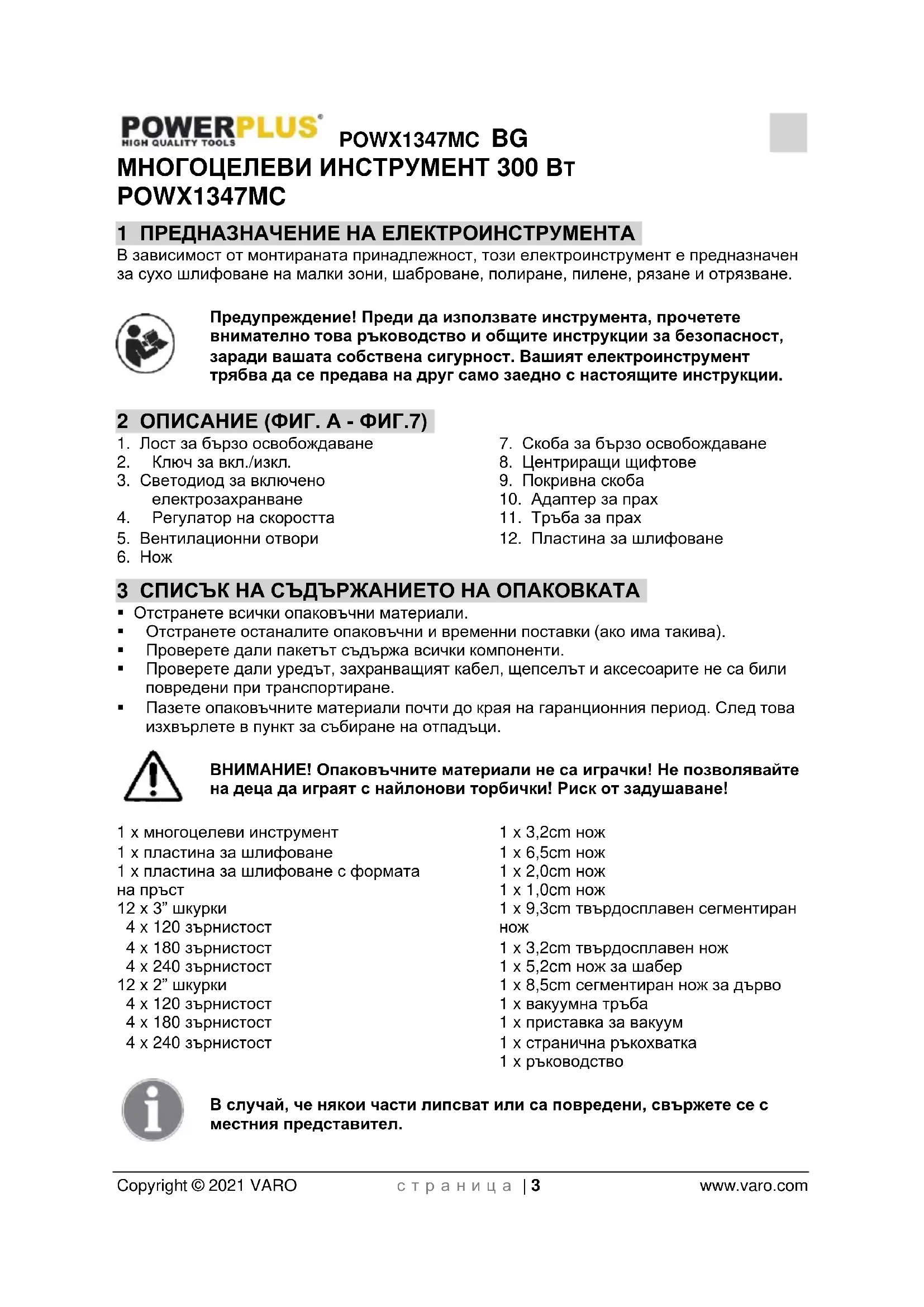 Copyright © 2021 VARO с т р а н и ц а | 3 www.varo.com МНОГОЦЕЛЕВИ ИНСТРУМЕНТ 300 ВТ POWX1347MC 1 ПРЕДНАЗНАЧЕНИЕ НА ЕЛЕКТРОИНСТРУМЕНТА В зависимост от монтираната принадлежност, този електроинструмент е предназначен за сухо шлифоване на малки зони, шаброване, полиране, пилене, рязане и отрязване. Предупреждение! Преди да използвате инструмента, прочетете внимателно това ръководство и общите инструкции за безопасност, заради вашата собствена сигурност. Вашият електроинструмент трябва да се предава на друг само заедно с настоящите инструкции. 2 ОПИСАНИЕ (ФИГ. A - ФИГ.7)