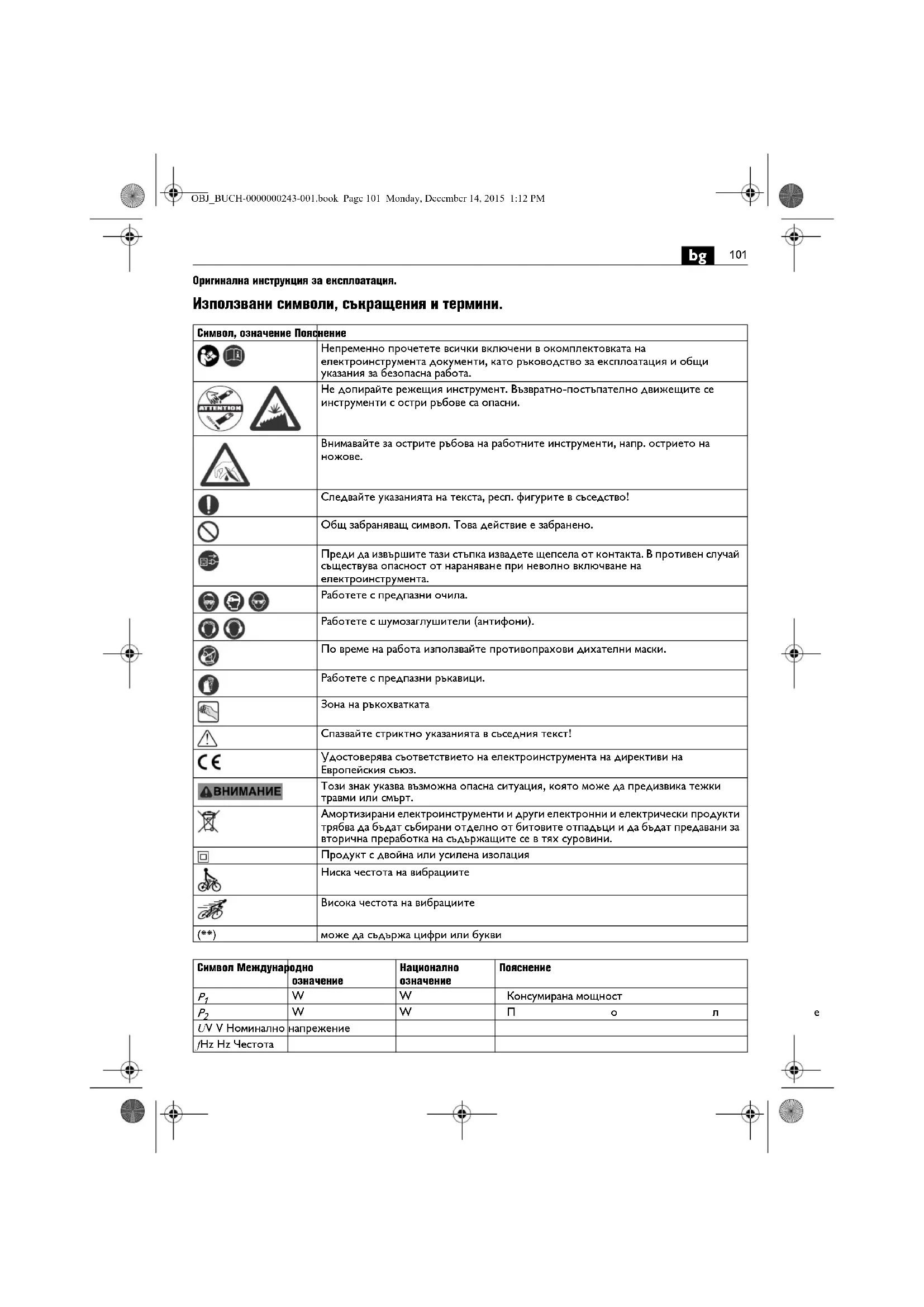 Следвайте указанията на текста, респ. фигурите в съседство! Общ забраняващ символ. Това действие е забранено. Преди да извършите тази стъпка извадете щепсела от контакта. В противен случай съществува опасност от нараняване при неволно включване на електроинструмента. Работете с предпазни очила. Работете с шумозаглушители (антифони). По време на работа използвайте противопрахови дихателни маски. Работете с предпазни ръкавици. Зона на ръкохватката Спазвайте стриктно указанията в съседния текст! Удостоверява съответствието на електроинструмента на директиви на Европейския съюз. Този знак указва възможна опасна ситуация, която може да предизвика тежки травми или смърт. Амортизирани електроинструменти и други електронни и електрически продукти трябва да бъдат събирани отделно от битовите отпадъци и да бъдат предавани за вторична преработка на съдържащите се в тях суровини. Продукт с двойна или усилена изолация Ниска честота на вибрациите Висока честота на вибрациите (**) може да съдържа цифри или букви Символ Международно