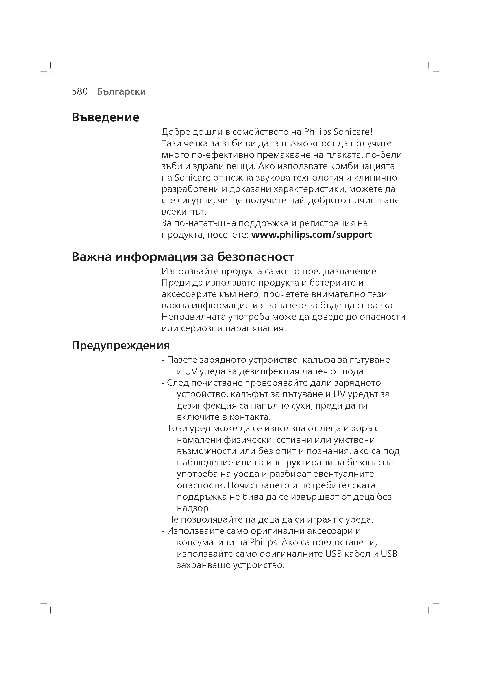 - Не позволявайте на деца да си играят с уреда. - Използвайте само оригинални аксесоари и консумативи на Philips. Ако са предоставени, използвайте само оригиналните USB кабел и USB захранващо устройство.581