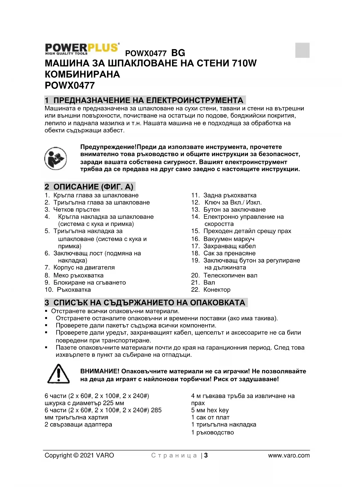 - 15 ДЕКЛАРАЦИЯ ЗА СЪОТВЕТСТВИЕ POWX0477 BG Copyright © 2021 VARO С т р а н и ц а | 3 www.varo.com МАШИНА ЗА ШПАКЛОВАНЕ НА СТЕНИ 710W КОМБИНИРАНА POWX0477 1 ПРЕДНАЗНАЧЕНИЕ НА ЕЛЕКТРОИНСТРУМЕНТА Машината е предназначена за шпакловане на сухи стени, тавани и стени на вътрешни или външни повърхности, почистване на остатъци по подове, бояджийски покрития, лепило и паднала мазилка и т.н. Нашата машина не е подходяща за обработка на обекти съдържащи азбест. Предупреждение!Преди да използвате инструмента, прочетете внимателно това ръководство и общите инструкции за безопасност, заради вашата собствена сигурност. Вашият електроинструмент трябва да се предава на друг само заедно с настоящите инструкции. 2 ОПИСАНИЕ (ФИГ. A) p. 13