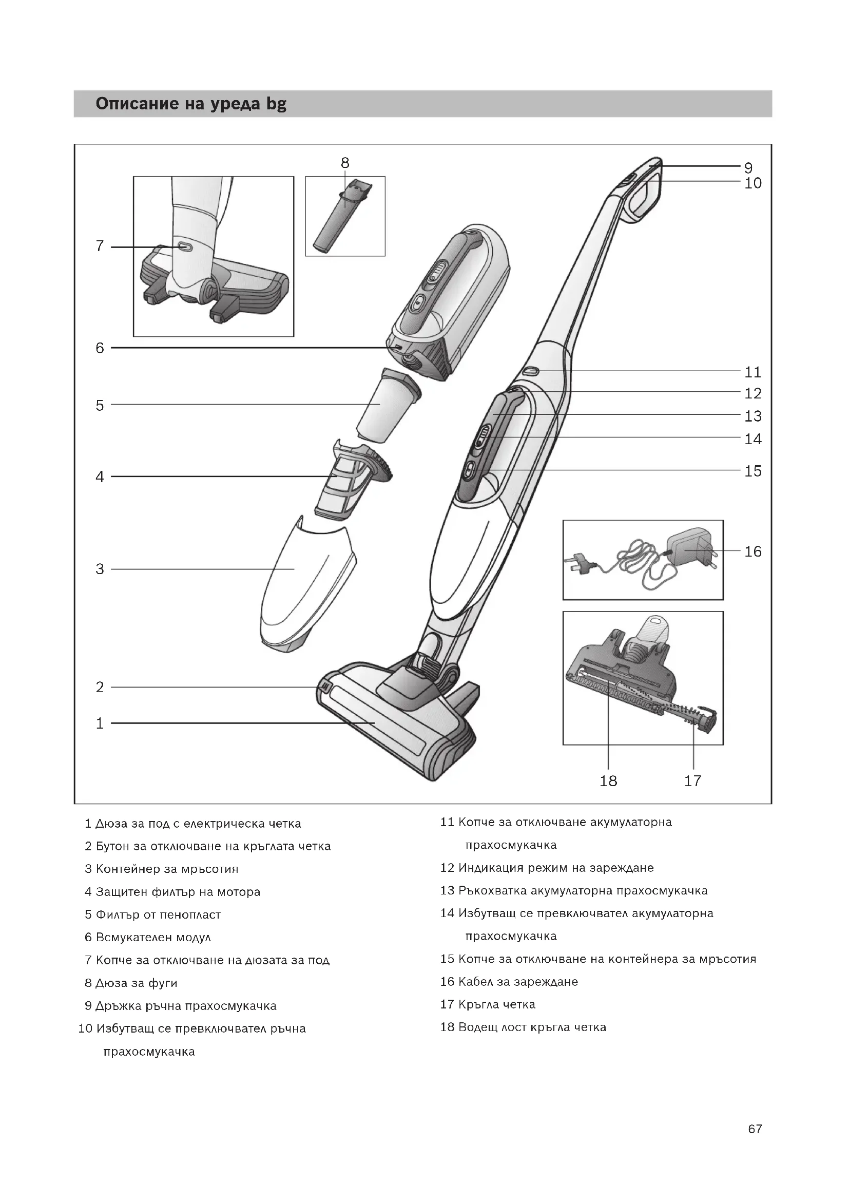 hu67 Описание на уреда bg 1 Дюза за под с електрическа четка 2 Бутон за отключване на кръглата четка 3 Контейнер за мръсотия 4 Защитен филтър на мотора 5 Филтър от пенопласт 6 Всмукателен модул 7 Копче за отключване на дюзата за под 8 Дюза за фуги 9 Дръжка ръчна прахосмукачка 10 Избутващ се превключвател ръчна прахосмукачка 11 Копче за отключване акумулаторна прахосмукачка 12 Индикация режим на зареждане 13 Ръкохватка акумулаторна прахосмукачка 14 Избутващ се превключвател акумулаторна прахосмукачка 15 Копче за отключване на контейнера за мръсотия 16 Кабел за зареждане 17 Кръгла четка 18 Водещ лост кръгла четка