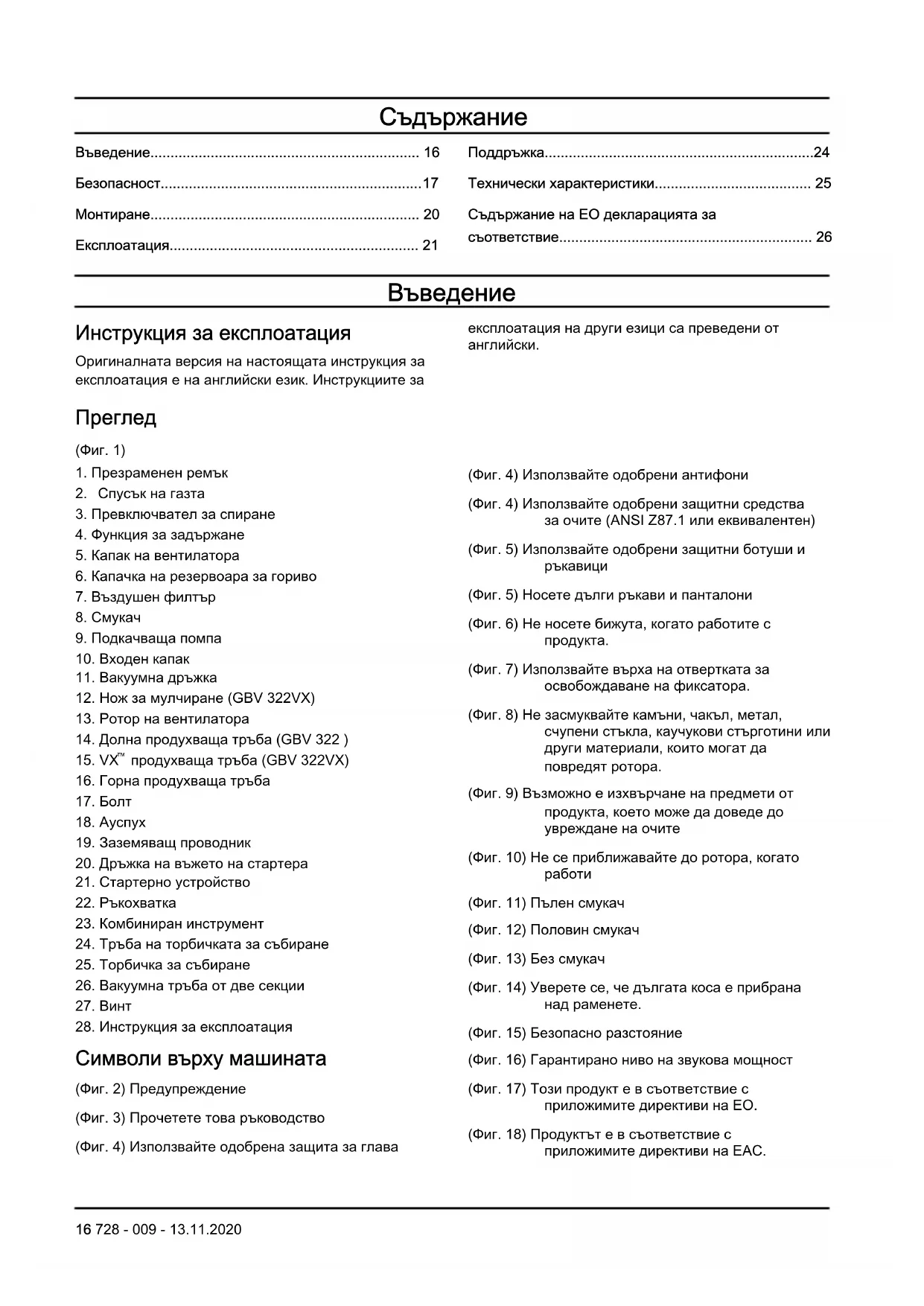 (Фиг. 11) Пълен смукач (Фиг. 12) Половин смукач (Фиг. 13) Без смукач (Фиг. 14) Уверете се, че дългата коса е прибрана над раменете. (Фиг. 15) Безопасно разстояние (Фиг. 16) Гарантирано ниво на звукова мощност (Фиг. 17) Този продукт е в съответствие с приложимите директиви на EO. (Фиг. 18) Продуктът е в съответствие с приложимите директиви на EAC. 16 728 - 009 - 13.11.2020(Фиг. 19) Продуктът е в съответствие с приложимите директиви на Украйна. (Фиг. 20) Продуктът е в съответствие с регламентите относно електромагнетична съвместимост (EMC) на Австралия. Забележка: Останалите символи/стикери на продукта се отнасят до изисквания по отношение на сертификати за други търговски зони. Емисии Euro V ПРЕДУПРЕЖДЕНИЕ: Намесата в двигателя прави невалидно ЕС одобрението на тип на този продукт. Отговорност за продукта Както е посочено в законите за отговорност за вреди, причинени от стоки, ние не носим отговорност за щети, причинени от нашия продукт, ако: