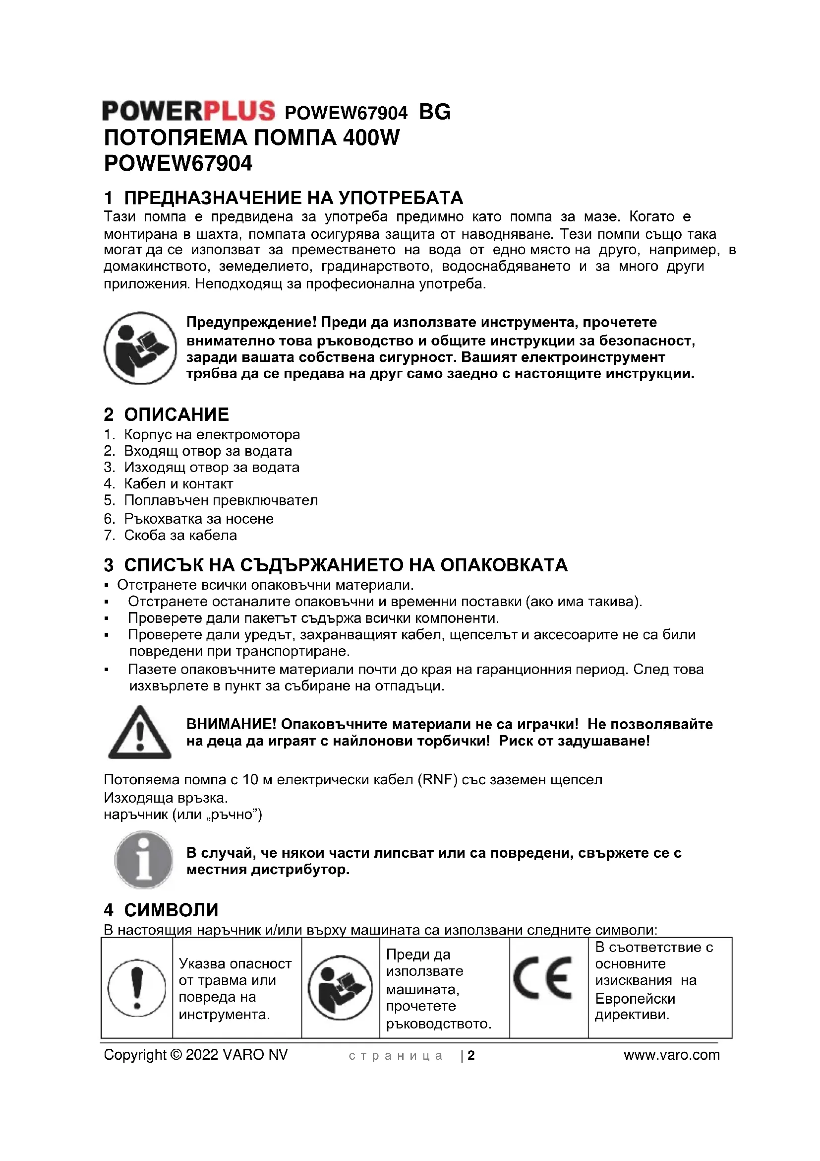 - 16 ДЕКЛАРАЦИЯ ЗА СЪОТВЕТСТВИЕ POWEW67904 BG Copyright © 2022 VARO NV с т р а н и ц а | 2 www.varo.com ПОТОПЯЕМА ПОМПА 400W POWEW67904 1 ПРЕДНАЗНАЧЕНИЕ НА УПОТРЕБАТА Тази помпа е предвидена за употреба предимно като помпа за мазе. Когато е монтирана в шахта, помпата осигурява защита от наводняване. Тези помпи също така могат да се използват за преместването на вода от едно място на друго, например, в домакинството, земеделието, градинарството, водоснабдяването и за много други приложения. Неподходящ за професионална употреба. Предупреждение! Преди да използвате инструмента, прочетете внимателно това ръководство и общите инструкции за безопасност, заради вашата собствена сигурност. Вашият електроинструмент трябва да се предава на друг само заедно с настоящите инструкции. 2 ОПИСАНИЕ p. 8