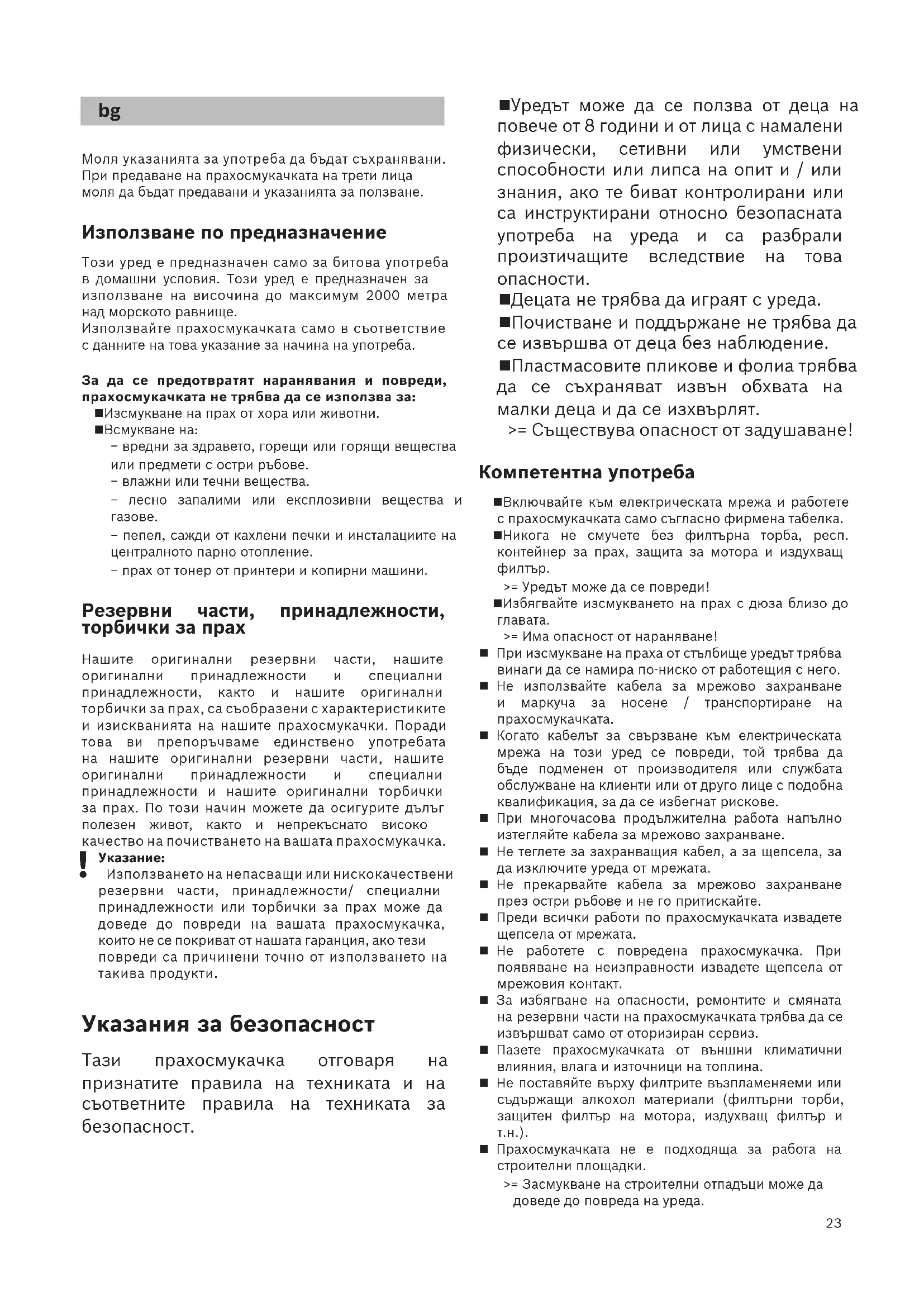 Децата не трябва да играят с уреда. Почистване и поддържане не трябва да се извършва от деца без наблюдение. Пластмасовите пликове и фолиа трябва да се съхраняват извън обхвата на малки деца и да се изхвърлят. >= Съществува опасност от задушаване! Компетентна употреба Включвайте към електрическата мрежа и работете с прахосмукачката само съгласно фирмена табелка. Никога не смучете без филтърна торба, респ. контейнер за прах, защита за мотора и издухващ