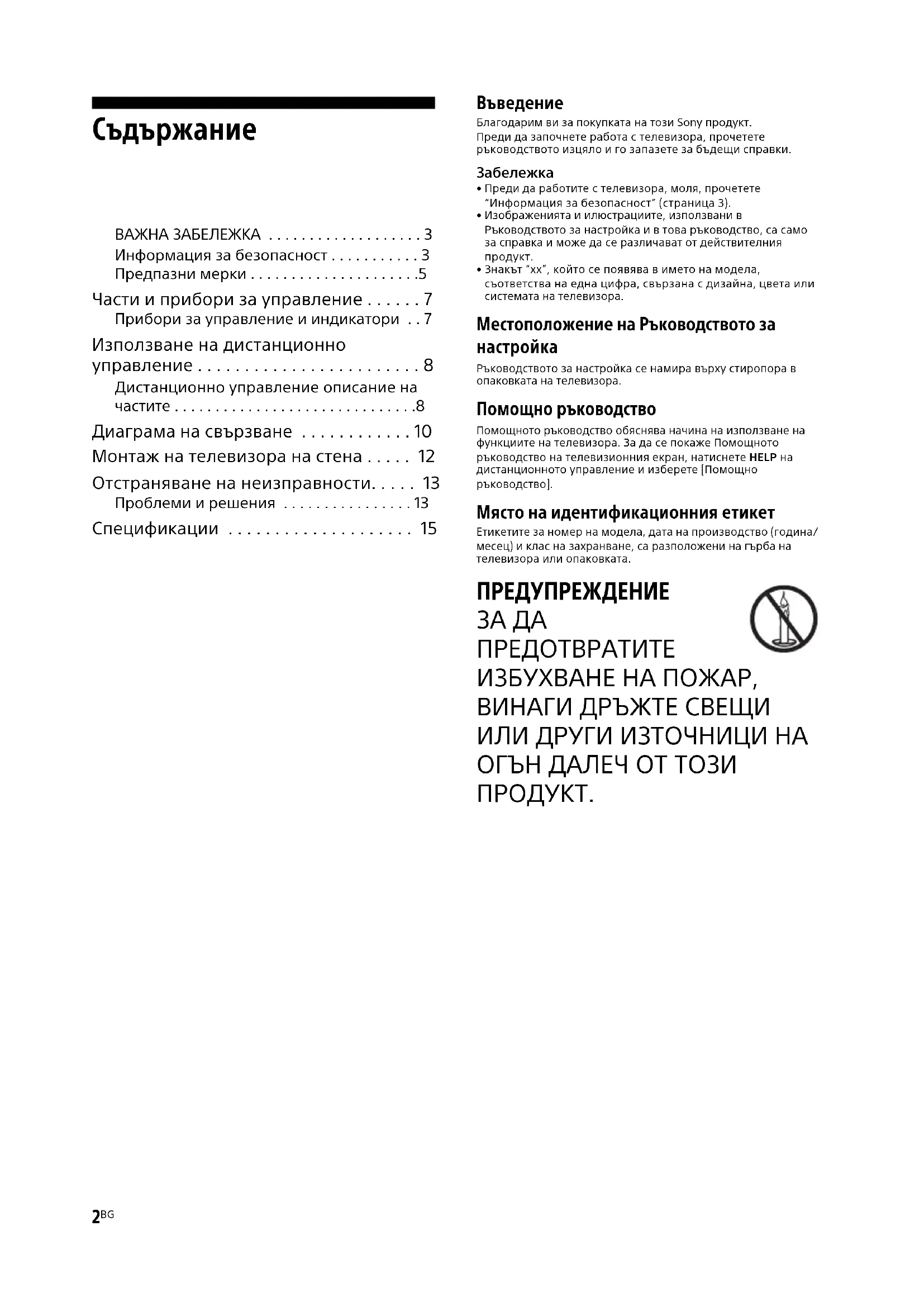 Ръководството за настройка се намира върху стиропора в опаковката на телевизора. Помощно ръководство Помощното ръководство обяснява начина на използване на функциите на телевизора. За да се покаже Помощното ръководство на телевизионния екран, натиснете HELP на дистанционното управление и изберете [Помощно ръководство]. Място на идентификационния етикет Етикетите за номер на модела, дата на производство (година/месец) и клас на захранване, са разположени на гърба на телевизора или опаковката. ПРЕДУПРЕЖДЕНИЕ