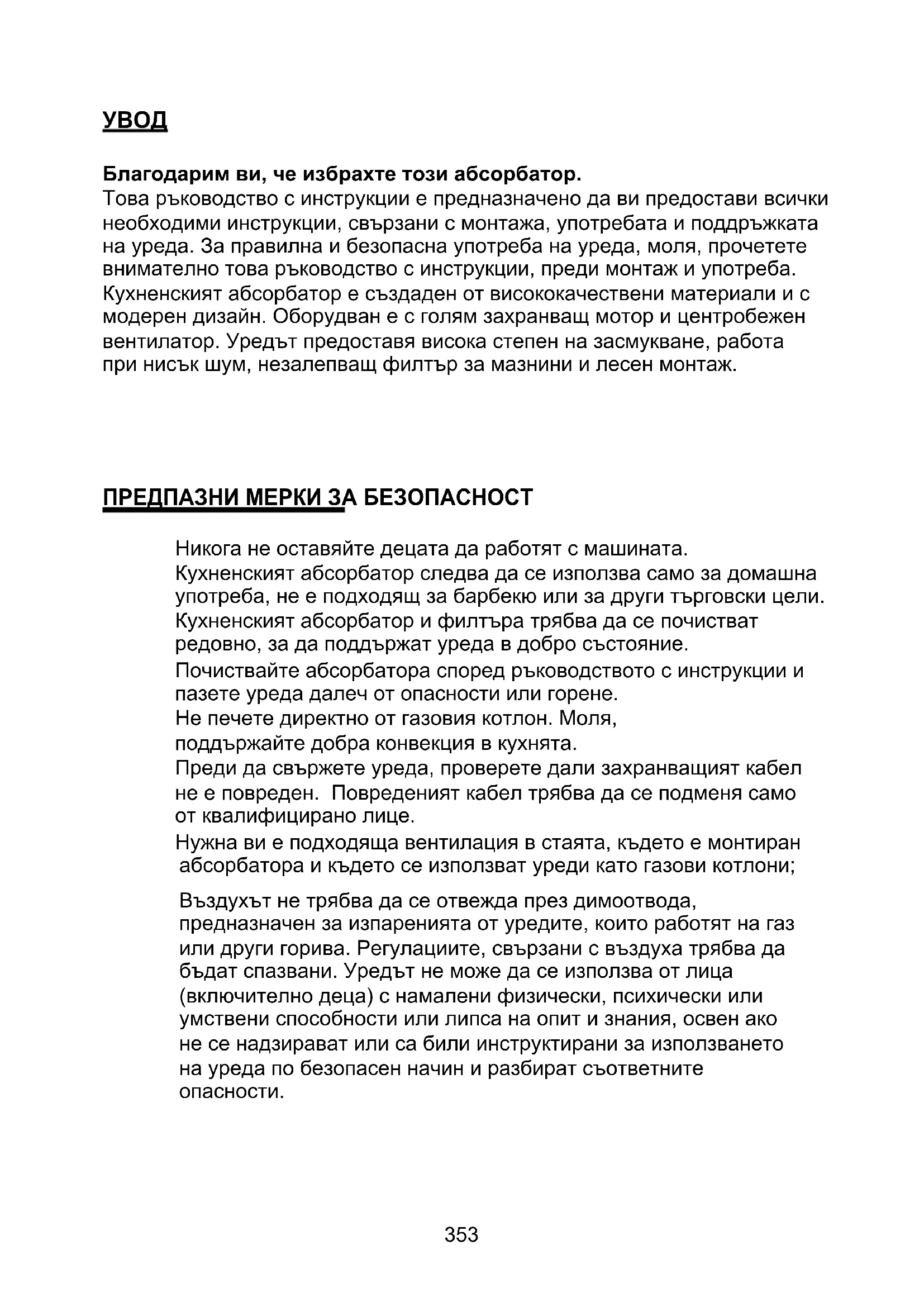 377УВОД Благодарим ви, че избрахте този абсорбатор. Това ръководство с инструкции е предназначено да ви предостави всички необходими инструкции, свързани с монтажа, употребата и поддръжката на уреда. За правилна и безопасна употреба на уреда, моля, прочетете внимателно това ръководство с инструкции, преди монтаж и употреба. Кухненският абсорбатор е създаден от висококачествени материали и с модерен дизайн. Оборудван е с голям захранващ мотор и центробежен вентилатор. Уредът предоставя висока степен на засмукване, работа при нисък шум, незалепващ филтър за мазнини и лесен монтаж. ПРЕДПАЗНИ МЕРКИ ЗА БЕЗОПАСНОСТ Никога не оставяйте децата да работят с машината. Кухненският абсорбатор следва да се използва само за домашна употреба, не е подходящ за барбекю или за други търговски цели. Кухненският абсорбатор и филтъра трябва да се почистват редовно, за да поддържат уреда в добро състояние. Почиствайте абсорбатора според ръководството с инструкции и пазете уреда далеч от опасности или горене. Не печете директно от газовия котлон. Моля, поддържайте добра конвекция в кухнята. Преди да свържете уреда, проверете дали захранващият кабел не е повреден. Повреденият кабел трябва да се подменя само от квалифицирано лице. Нужна ви е подходяща вентилация в стаята, където е монтиран абсорбатора и където се използват уреди като газови котлони; Въздухът не трябва да се отвежда през димоотвода, предназначен за изпаренията от уредите, които работят на газ или други горива. Регулациите, свързани с въздуха трябва да бъдат спазвани. Уредът не може да се използва от лица (включително деца) с намалени физически, психически или умствени способности или липса на опит и знания, освен ако не се надзирават или са били инструктирани за използването на уреда по безопасен начин и разбират съответните