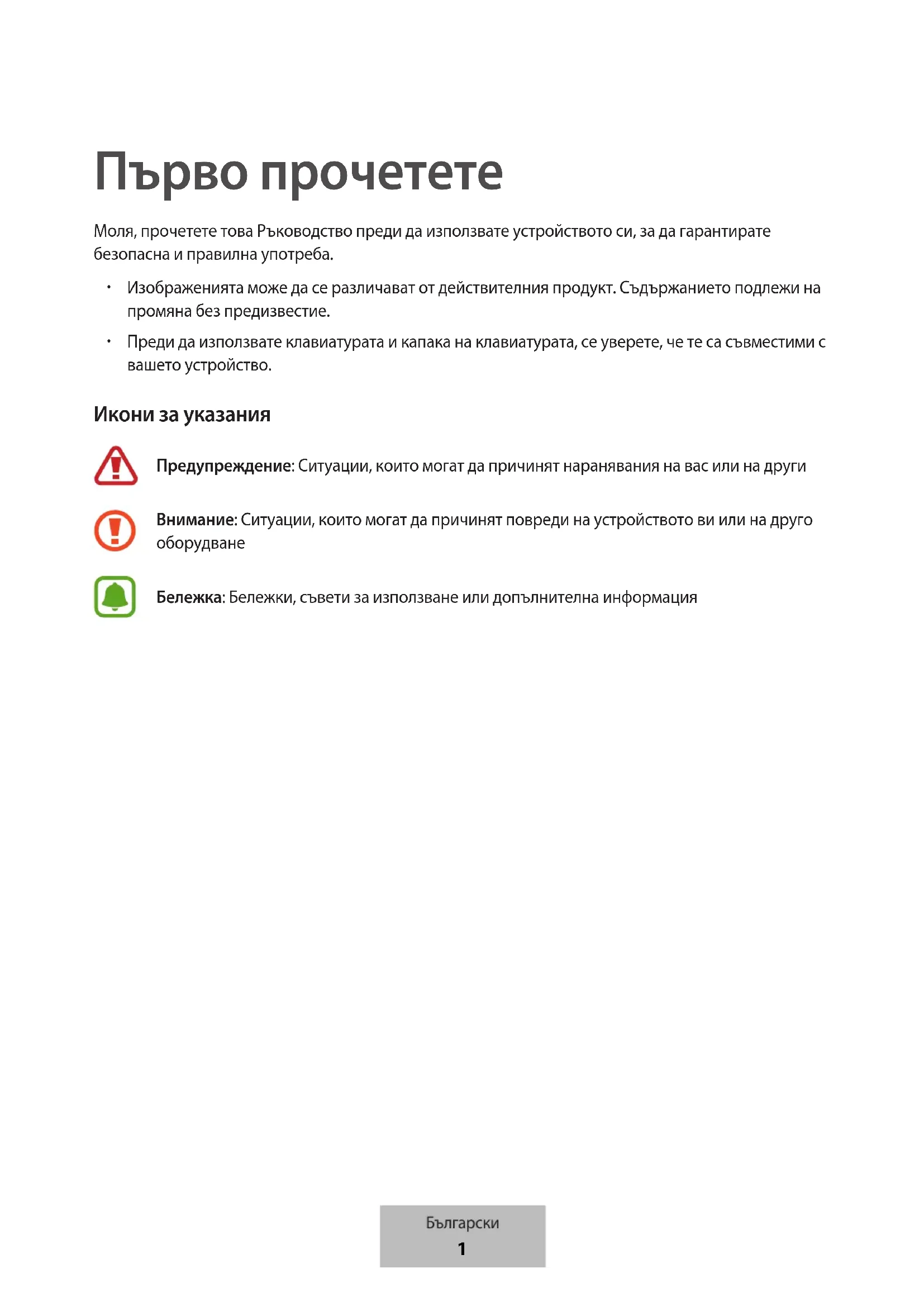 Преди да използвате клавиатурата и капака на клавиатурата, се уверете, че те са съвместими с вашето устройство. Икони за указания Предупреждение: Ситуации, които могат да причинят наранявания на вас или на други Внимание: Ситуации, които могат да причинят повреди на устройството ви или на друго