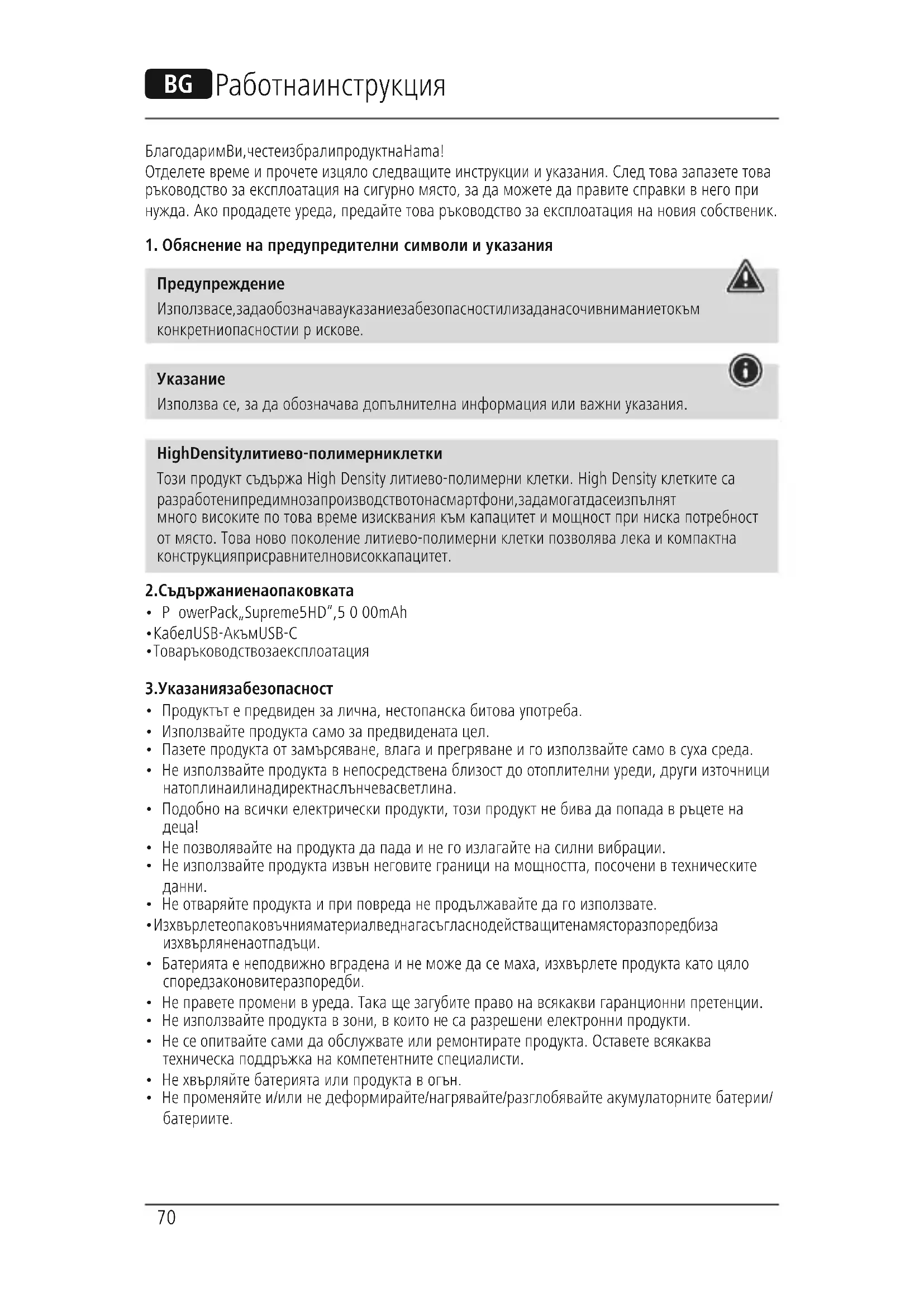 - Power Pack не трябва да се зарежда иразрежда едновременно!72 Предупреждение