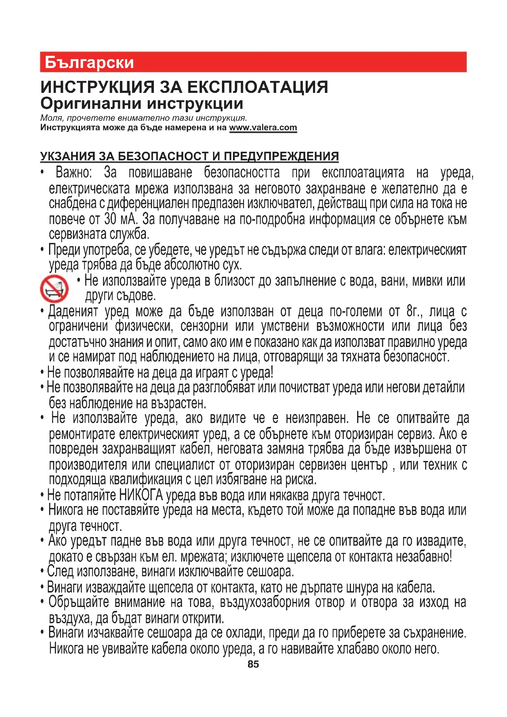 ИНСТРУКЦИЯ ЗА ЕКСПЛОАТАЦИЯ Оригинални инструкции Моля, прочетете внимателно тази инструкция. Инструкцията може да бъде намерена и на www.valera.com