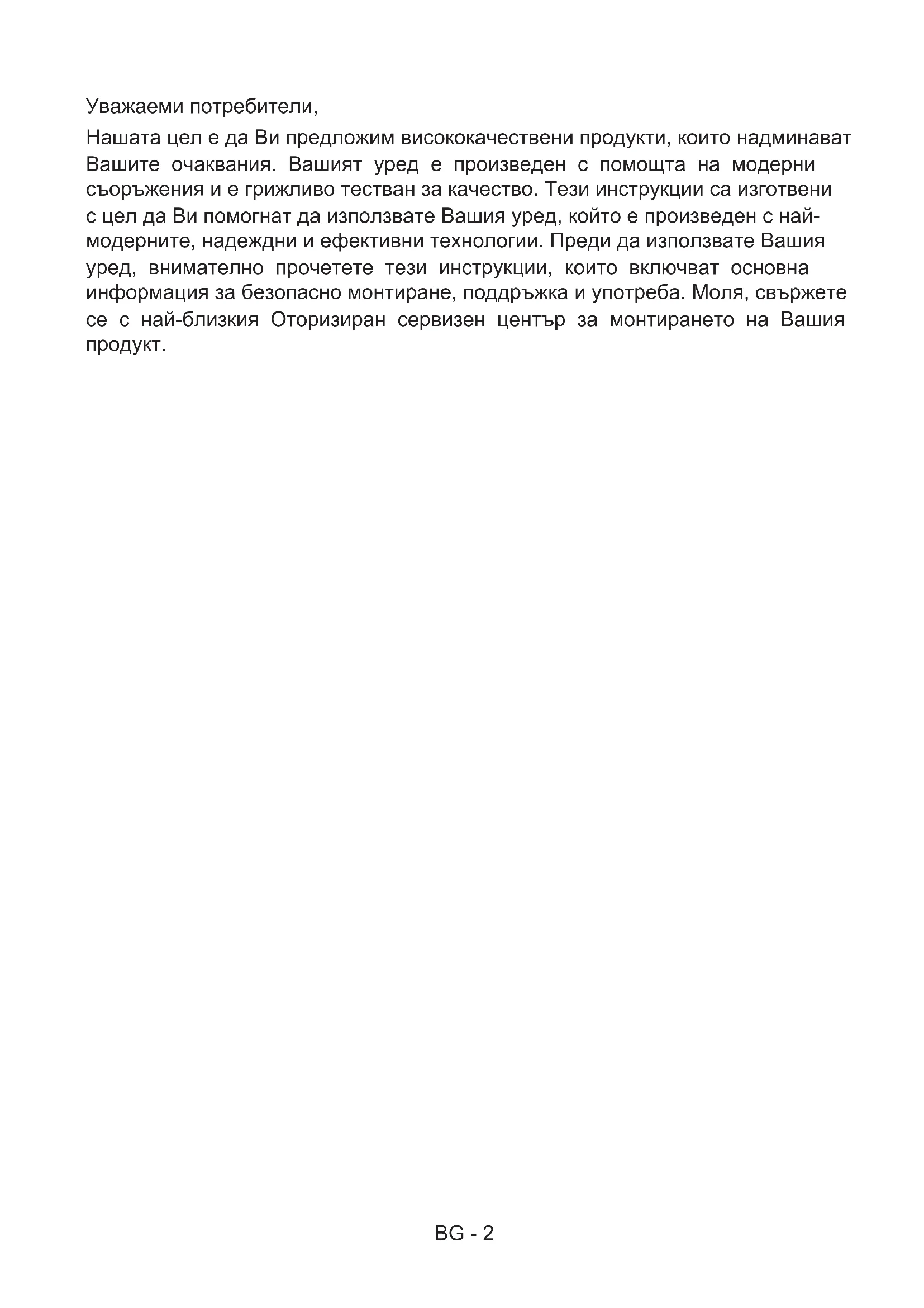 - Уредът трябва да бъде монтиран и въведен в експлоатация от квали- фициран техник. Производителят не поема отговорност за повреди, които е възможно да възникнат вследствие на неправилно разпо- ложение или монтаж от неупълно- мощено лице.