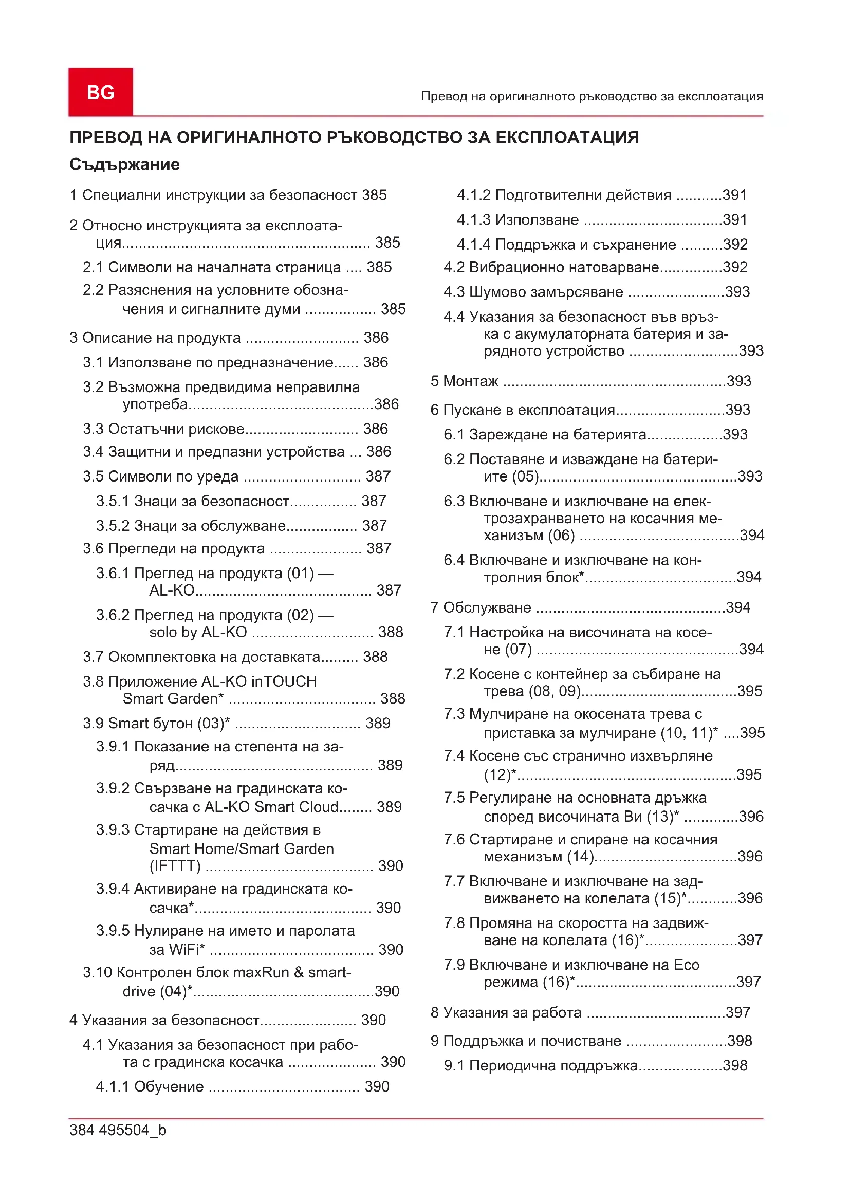 обозначения и сигналните думи ОПАСНОСТ! Обозначава непосредстве- но опасна ситуация, която - ако не бъде избе- гната - може да има като последствие смърт или тежко нараняване. ПРЕДУПРЕЖДЕНИЕ! Обозначава потен- циална опасна ситуация, която - ако не бъде избегната - би могла да доведе до смърт или тежко нараняване. ВНИМАНИЕ! Обозначава потенциално опасна ситуация, която - ако не бъде избегна- та - може да има като следствие леко или умерено нараняване. ВНИМАНИЕ! Обозначава ситуация, която - ако не се избегне - може да предизвика мате- риални щети. УКАЗАНИЕ Специални указания за по-до- бро разбиране и боравене.BG 386 495504_b Описание на продукта 3 ОПИСАНИЕ НА ПРОДУКТА Това ръководство за работа описва различни модели градински косачки с ръчно управление от марките AL‑KO и solobyAL‑KO с различно оборудване. Оборудването на отделните мо- дели е представено в техническите данни на инструкциите за монтаж. Уредът може да бъде използван единствено с литиево-йонните акумулаторни батерии и за- рядните устройства, посочени в техническите данни. За повече информация за акумулатор- ните батерии и зарядните устройства вижте отделните ръководства за работа: