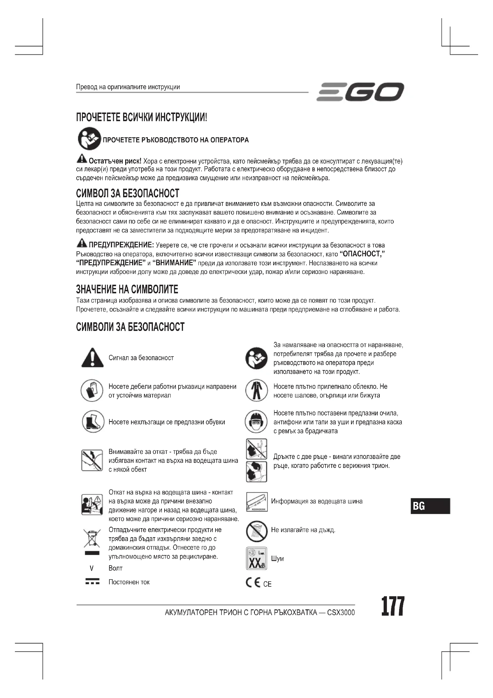 АКУМУЛАТОРЕН ТРИОН С ГОРНА РЪКОХВАТКА — CSX3000 ПРОЧЕТЕТЕ ВСИЧКИ ИНСТРУКЦИИ! ПРОЧЕТЕТЕ РЪКОВОДСТВОТО НА ОПЕРАТОРА Остатъчен риск! Хора с електронни устройства, като пейсмейкър трябва да се консултират с лекуващия(те) си лекар(и) преди употреба на този продукт. Работата с електрическо оборудване в непосредствена близост до сърдечен пейсмейкър може да предизвика смущение или неизправност на пейсмейкъра. СИМВОЛ ЗА БЕЗОПАСНОСТ Целта на символите за безопасност е да привличат вниманието към възможни опасности. Символите за безопасност и обясненията към тях заслужават вашето повишено внимание и осъзнаване. Символите за безопасност сами по себе си не елиминират каквато и да е опасност. Инструкциите и предупрежденията, които предоставят не са заместители за подходящите мерки за предотвратяване на инцидент. ПРЕДУПРЕЖДЕНИЕ: Уверете се, че сте прочели и осъзнали всички инструкции за безопасност в това Ръководство на оператора, включително всички известяващи символи за безопасност, като “ОПАСНОСТ,” “ПРЕДУПРЕЖДЕНИЕ” и “ВНИМАНИЕ” преди да използвате този инструмент. Неспазването на всички инструкции изброени долу може да доведе до електрически удар, пожар и/или сериозно нараняване. ЗНАЧЕНИЕ НА СИМВОЛИТЕ Тази страница изобразява и описва символите за безопасност, които може да се появят по този продукт. Прочетете, осъзнайте и следвайте всички инструкции по машината преди предприемане на сглобяване и работа. СИМВОЛИ ЗА БЕЗОПАСНОСТ Сигнал за безопасностЗа намаляване на опасността от нараняване, потребителят трябва да прочете и разбере ръководството на оператора преди използването на този продукт.Носете дебели работни ръкавици направени от устойчив материалНосете плътно прилепнало облекло. Не носете шалове, огърлици или бижутаНосете нехлъзгащи се предпазни обувкиНосете плътно поставени предпазни очила, антифони или тапи за уши и предпазна каска с ремък за брадичкатаВнимавайте за откат - трябва да бъде избягван контакт на върха на водещата шина с някой обектДръжте с две ръце - винаги използвайте две ръце, когато работите с верижния трион.Откат на върха на водещата шина - контакт на върха може да причини внезапно движение нагоре и назад на водещата шина, което може да причини сериозно нараняване.Отпадъчните електрически продукти не трябва да бъдат изхвърляни заедно с домакинския отпадък. Отнесете го до упълномощено място за рециклиране.