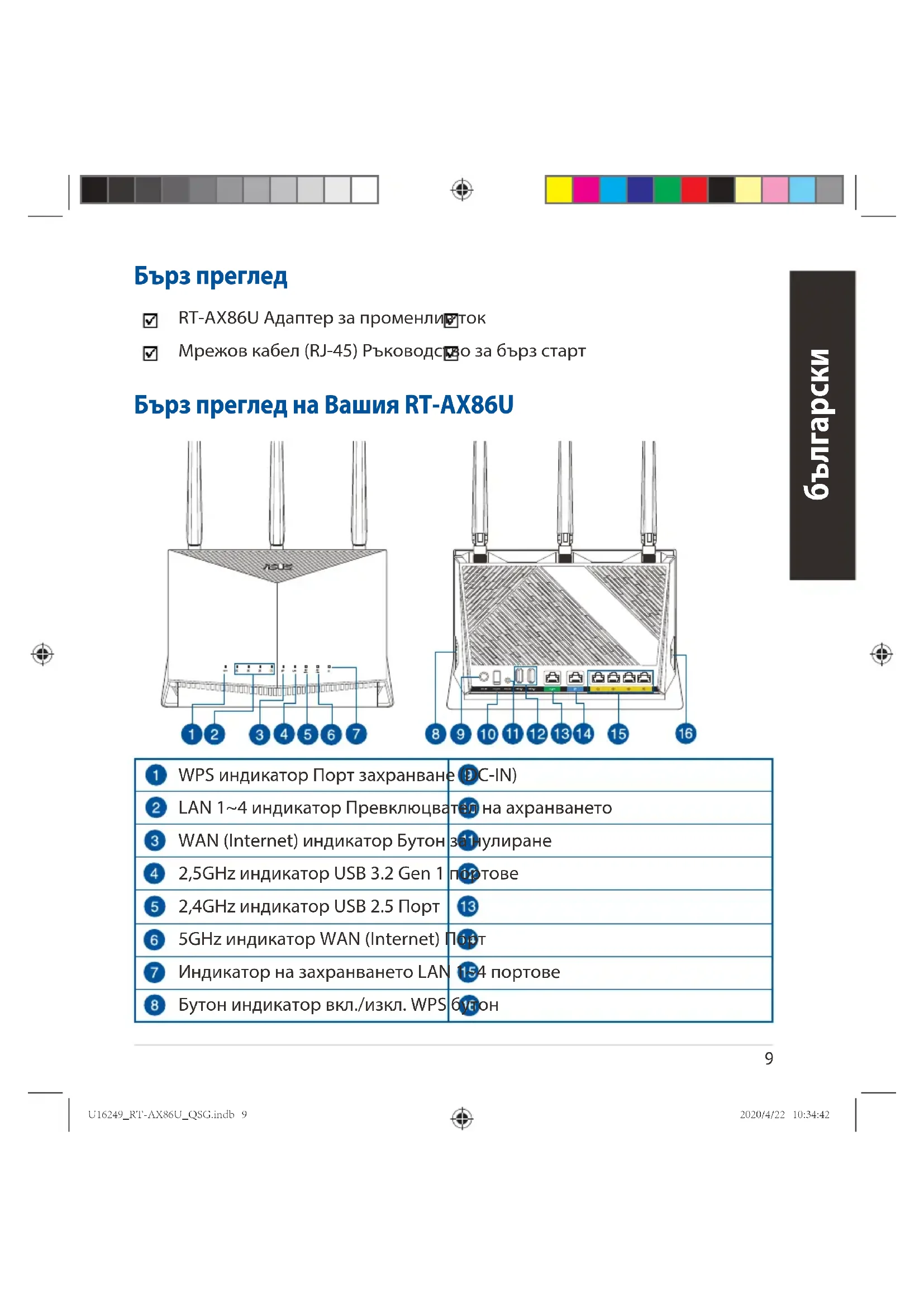 Бърз преглед на Вашия RT-AX86U Бърз преглед на Вашия RT-AX86U Бърз преглед Бърз преглед RT-AX86U Адаптер за променлив ток Мрежов кабел (RJ-45) Ръководство за бърз старт WPS индикатор Порт захранване (DC-IN) LAN 1~4 индикатор Пpeвклюцватeл на ахранването WAN (Internet) индикатор Бутон за нулиране 2,5GHz индикатор USB 3.2 Gen 1 портове 2,4GHz индикатор USB 2.5 Порт 5GHz индикатор WAN (Internet) Порт Индикатор на захранването LAN 1~4 портове Бутон индикатор вкл./изкл. WPS бутон U16249_RT-AX86U_QSG.indb 9U16249_RT-AX86U_QSG.indb 9 2020/4/22 10:34:422020/4/22 10:34:4210