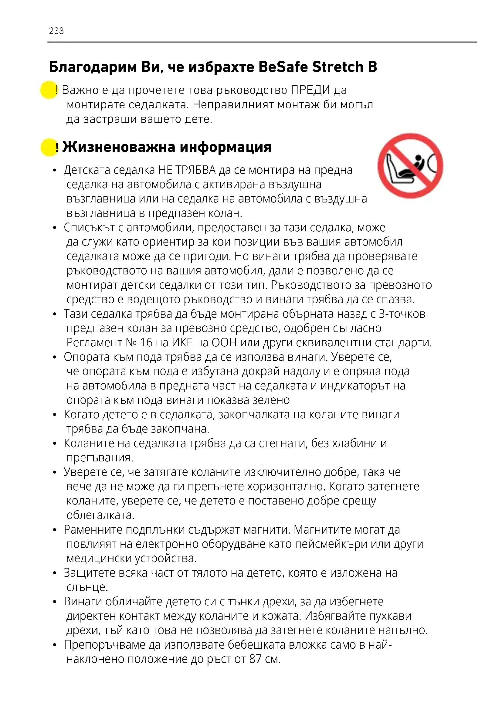 - Препоръчваме да използвате бебешката вложка само в най- наклонено положение до ръст от 87 см. ! Важно е да прочетете това ръководство ПРЕДИ да монтирате седалката. Неправилният монтаж би могъл да застраши вашето дете. Благодарим Ви, че избрахте BeSafe Stretch B239