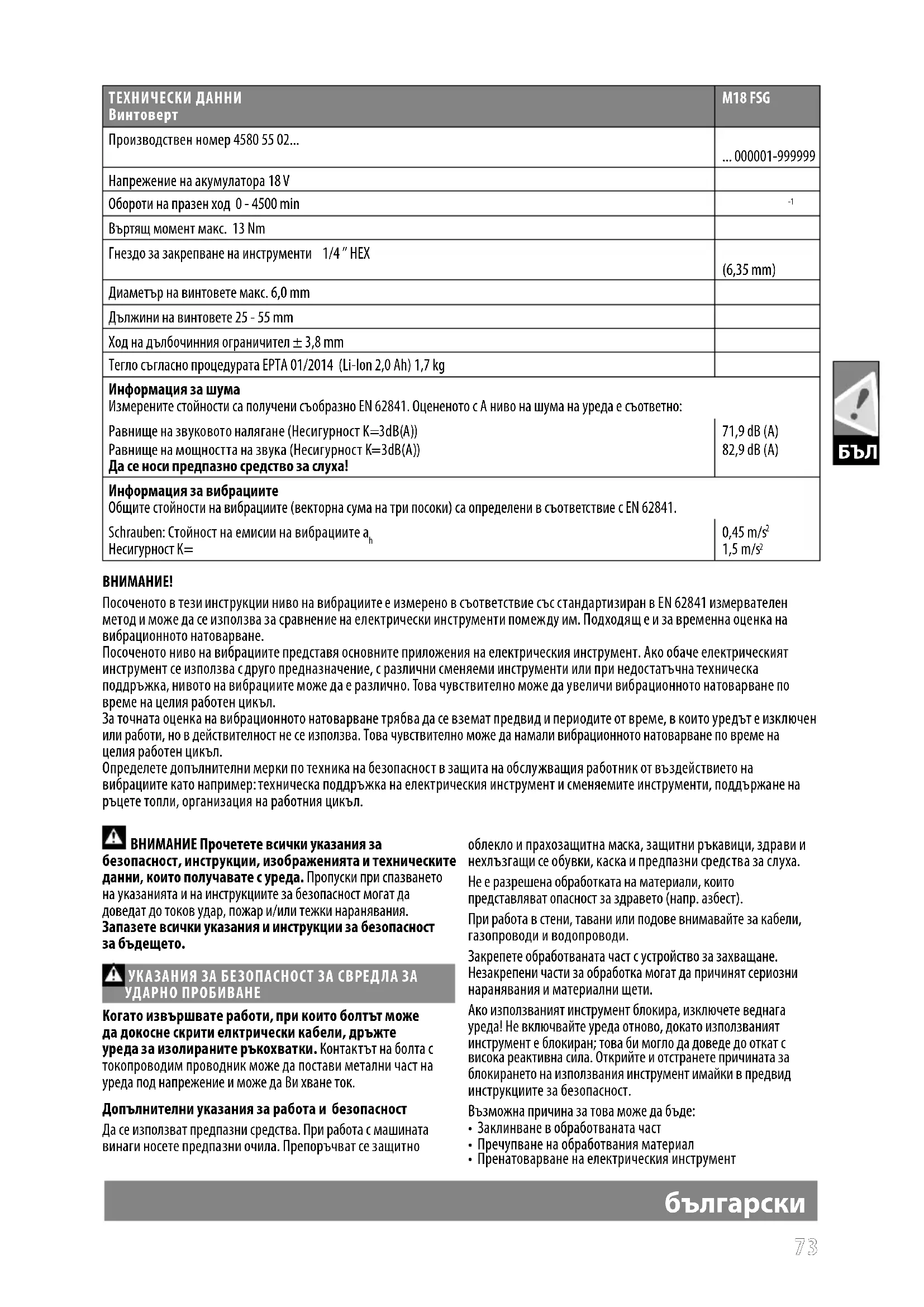 Въртящ момент макс. 13 Nm Гнездо за закрепване на инструменти 1/4 ” HEX (6,35 mm) Диаметър на винтовете макс. 6,0 mm Дължини на винтовете 25 - 55 mm Ход на дълбочинния ограничител ± 3,8 mm Тегло съгласно процедурата EPTA 01/2014 (Li-Ion 2,0 Ah) 1,7 kg Информация за шума Измерените стойности са получени съобразно EN 62841. Оцененото с A ниво на шума на уреда е съответно: Равнище на звуковото налягане (Несигурност K=3dB(A)) Равнище на мощността на звука (Несигурност K=3dB(A)) Да се носи предпазно средство за слуха! 71,9 dB (A) 82,9 dB (A) Информация за вибрациите Общите стойности на вибрациите (векторна сума на три посоки) са определени в съответствие с EN 62841. Schrauben: Стойност на емисии на вибрациите a