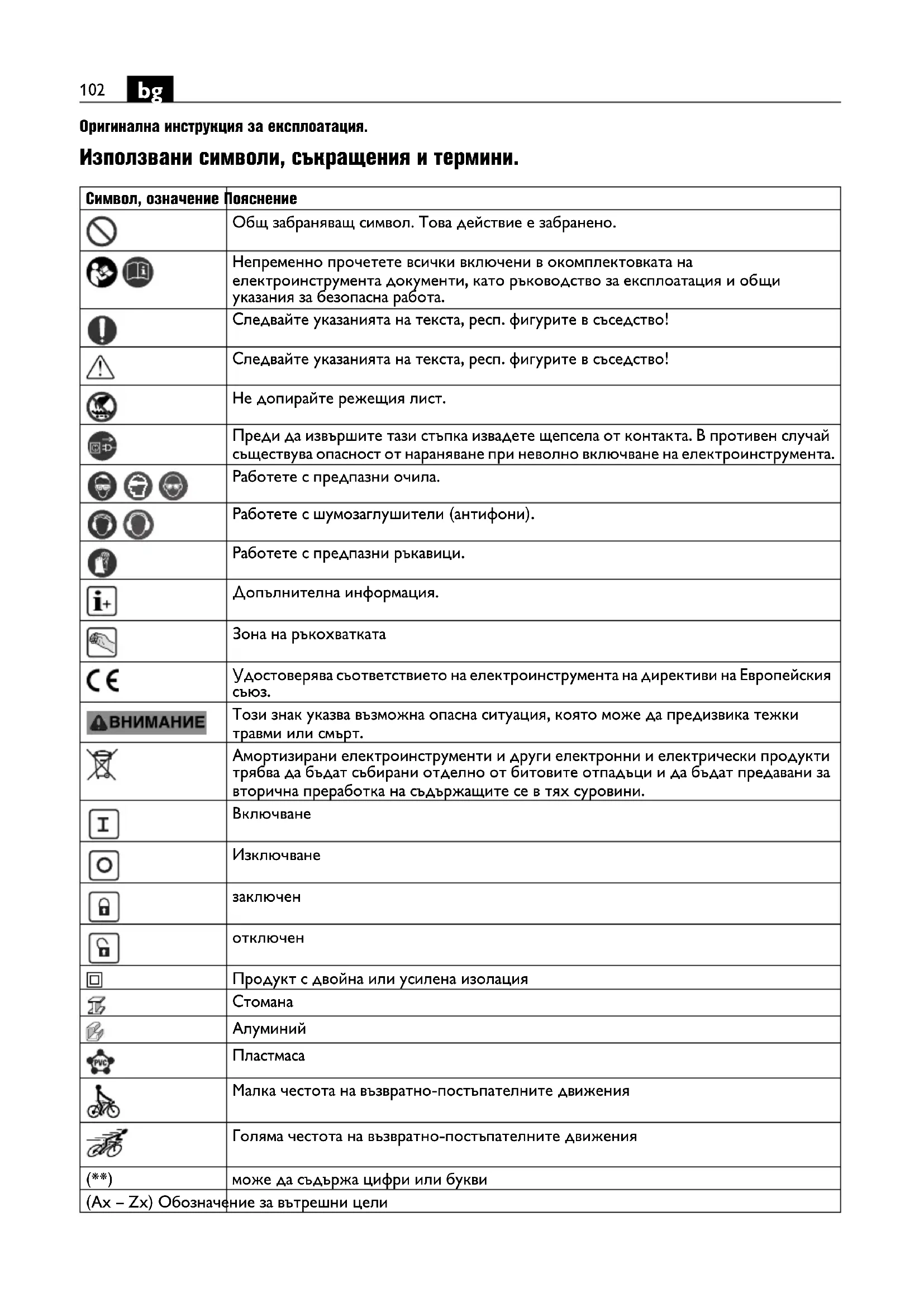 Оригинална инструкция за експлоатация. Използвани символи, съкращения и термини. Символ, означение Пояснение Общ забраняващ символ. Това действие е забранено. Непременно прочетете всички включени в окомплектовката на електроинструмента документи, като ръководство за експлоатация и общи указания за безопасна работа. Следвайте указанията на текста, респ. фигурите в съседство! Следвайте указанията на текста, респ. фигурите в съседство! Не допирайте режещия лист. Преди да извършите тази стъпка извадете щепсела от контакта. В противен случай съществува опасност от нараняване при неволно включване на електроинструмента. Работете с предпазни очила. Работете с шумозаглушители (антифони). Работете с предпазни ръкавици. Допълнителна информация. Зона на ръкохватката Удостоверява съответствието на електроинструмента на директиви на Европейския