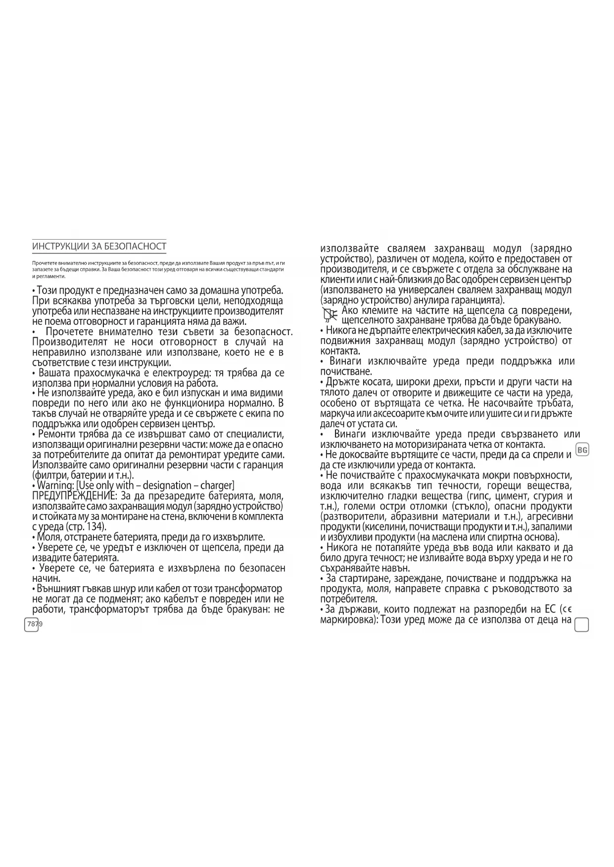 - Warning: [Use only with – designation – charger] ПРЕДУПРЕЖДЕНИЕ: За да презаредите батерията, моля, използвайте само захранващия модул (зарядно устройство) и стойката му за монтиране на стена, включени в комплекта с уреда (стр. 134).