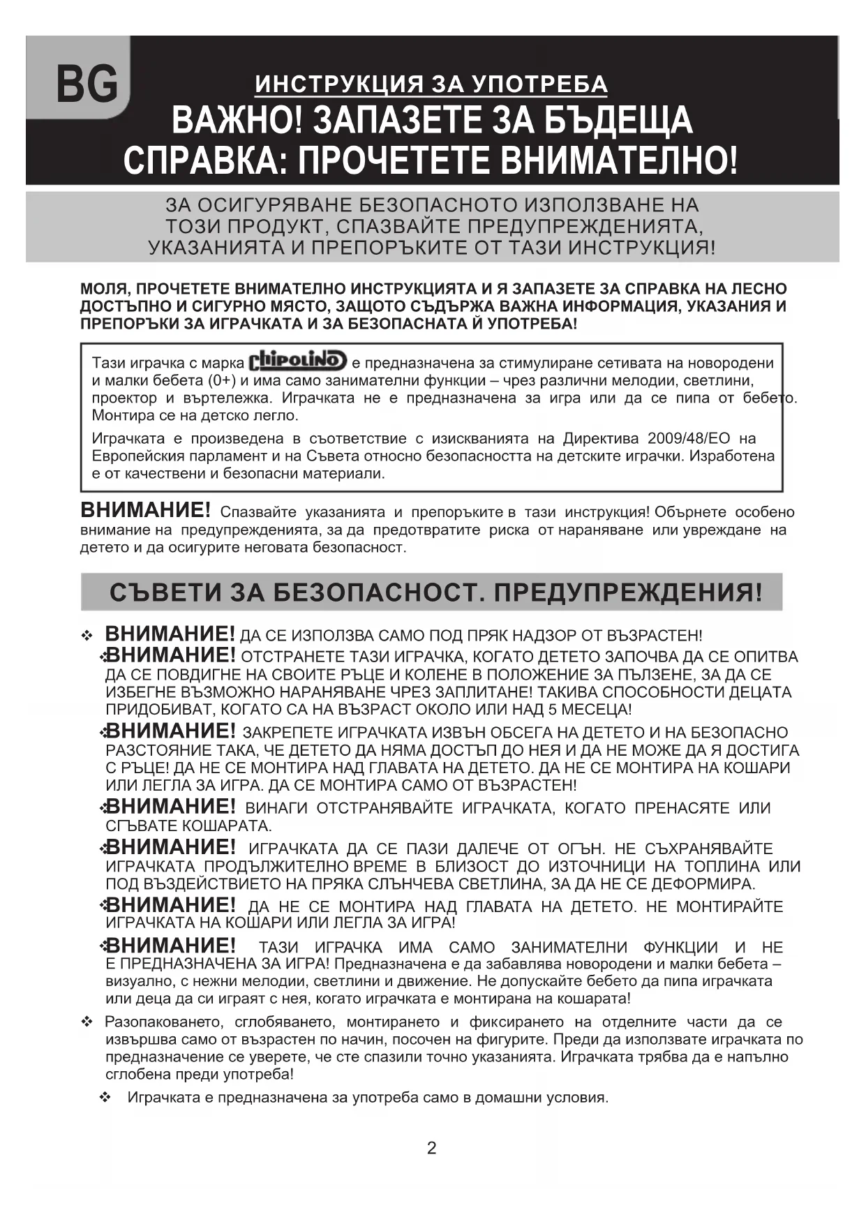 МОЛЯ, ПРОЧЕТЕТЕ ВНИМАТЕЛНО ИНСТРУКЦИЯТА И Я ЗАПАЗЕТЕ ЗА СПРАВКА НА ЛЕСНО ДОСТЪПНО И СИГУРНО МЯСТО, ЗАЩОТО СЪДЪРЖА ВАЖНА ИНФОРМАЦИЯ, УКАЗАНИЯ И ПРЕПОРЪКИ ЗА ИГРАЧКАТА И ЗА БЕЗОПАСНАТА Й УПОТРЕБА!Тази играчка с марка е предназначена за стимулиране сетивата на новородени и малки бебета (0+) и има само занимателни функции – чрез различни мелодии, светлини, проектор и въртележка. Играчката не е предназначена за игра или да се пипа от бебето. Монтира се на детско легло. Играчката е произведена в съответствие с изискванията на Директива 2009/48/ЕО на Европейския парламент и на Съвета относно безопасността на детските играчки. Изработена е от качествени и безопасни материали. ВНИМАНИЕ! Спазвайте указанията и препоръките в тази инструкция! Обърнете особено внимание на предупрежденията, за да предотвратите риска от нараняване или увреждане на детето и да осигурите неговата безопасност. СЪВЕТИ ЗА БЕЗОПАСНОСТ. ПРЕДУПРЕЖДЕНИЯ! ВНИМАНИЕ! ДА СЕ ИЗПОЛЗВА САМО ПОД ПРЯК НАДЗОР ОТ ВЪЗРАСТЕН! ВНИМАНИЕ! ОТСТРАНЕТЕ ТАЗИ ИГРАЧКА, КОГАТО ДЕТЕТО ЗАПОЧВА ДА СЕ ОПИТВА ДА СЕ ПОВДИГНЕ НА СВОИТЕ РЪЦЕ И КОЛЕНЕ В ПОЛОЖЕНИЕ ЗА ПЪЛЗЕНЕ, ЗА ДА СЕ ИЗБЕГНЕ ВЪЗМОЖНО НАРАНЯВАНЕ ЧРЕЗ ЗАПЛИТАНЕ! ТАКИВА СПОСОБНОСТИ ДЕЦАТА ПРИДОБИВАТ, КОГАТО СА НА ВЪЗРАСТ ОКОЛО ИЛИ НАД 5 МЕСЕЦА! ВНИМАНИЕ! ЗАКРЕПЕТЕ ИГРАЧКАТА ИЗВЪН ОБСЕГА НА ДЕТЕТО И НА БЕЗОПАСНО РАЗСТОЯНИЕ ТАКА, ЧЕ ДЕТЕТО ДА НЯМА ДОСТЪП ДО НЕЯ И ДА НЕ МОЖЕ ДА Я ДОСТИГА С РЪЦЕ! ДА НЕ СЕ МОНТИРА НАД ГЛАВАТА НА ДЕТЕТО. ДА НЕ СЕ МОНТИРА НА КОШАРИ ИЛИ ЛЕГЛА ЗА ИГРА. ДА СЕ МОНТИРА САМО ОТ ВЪЗРАСТЕН! ВНИМАНИЕ! ВИНАГИ ОТСТРАНЯВАЙТЕ ИГРАЧКАТА, КОГАТО ПРЕНАСЯТЕ ИЛИ СГЪВАТЕ КОШАРАТА. ВНИМАНИЕ! ИГРАЧКАТА ДА СЕ ПАЗИ ДАЛЕЧЕ ОТ ОГЪН. НЕ СЪХРАНЯВАЙТЕ ИГРАЧКАТА ПРОДЪЛЖИТЕЛНО ВРЕМЕ В БЛИЗОСТ ДО ИЗТОЧНИЦИ НА ТОПЛИНА ИЛИ ПОД ВЪЗДЕЙСТВИЕТО НА ПРЯКА СЛЪНЧЕВА СВЕТЛИНА, ЗА ДА НЕ СЕ ДЕФОРМИРА. ВНИМАНИЕ! ДА НЕ СЕ МОНТИРА НАД ГЛАВАТА НА ДЕТЕТО. НЕ МОНТИРАЙТЕ ИГРАЧКАТА НА КОШАРИ ИЛИ ЛЕГЛА ЗА ИГРА! ВНИМАНИЕ! ТАЗИ ИГРАЧКА ИМА САМО ЗАНИМАТЕЛНИ ФУНКЦИИ И НЕ Е ПРЕДНАЗНАЧЕНА ЗА ИГРА! Предназначена е да забавлява новородени и малки бебета – визуално, с нежни мелодии, светлини и движение. Не допускайте бебето да пипа играчката или деца да си играят с нея, когато играчката е монтирана на кошарата! Разопаковането, сглобяването, монтирането и фиксирането на отделните части да се извършва само от възрастен по начин, посочен на фигурите. Преди да използвате играчката по предназначение се уверете, че сте спазили точно указанията. Играчката трябва да е напълно сглобена преди употреба! Играчката е предназначена за употреба само в домашни условия.3