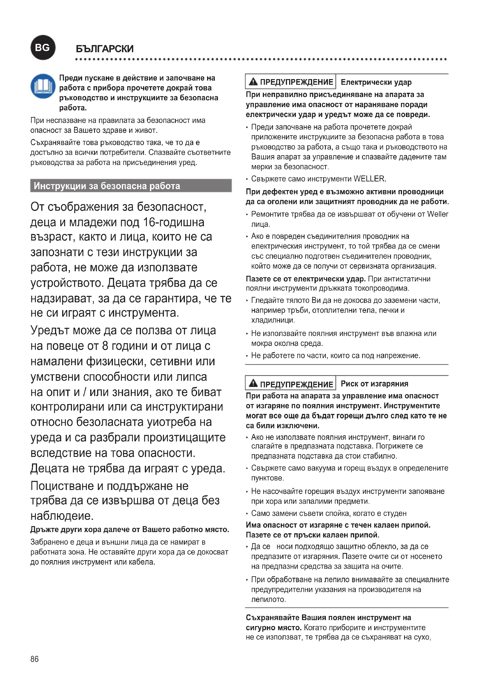 - Не Оставяйте запалителни предмети, течности или газове близо до нагорещения поялен инструмент. Мрежовият кабел може да бъде включван само в разрешените за тази цел мрежови контакти или адаптери. Проверете дали мрежовото напрежение съвпада с данните на фирмената табелка. Включвайте уредът в контакта само в изключено състояние. Не използвайте кабела за цели, за които той не е предвиден. Никога не носете прибора за кабела. Не използвайте кабела за изтегляне на щекера от контакта. Пазете кабела от горещина, масло и остри ръбове. Бъдете внимателни. Внимавайте, какво правите. Работете разумно. Не работете с поялния инструмент, ако не можете да се концентрирате. Избягвайте ненормално положение на тялото. Оформете ергономично правилно Вашето работно място, Внимавайте да стоите удобно при работа, неправилно положение на тялото причинява вреди на здравето. Работете с поялния инструмент само, ако той е в безупречно техническо състояние. Предпазните приспособления не трябва да са деактивирани. Отстранявайте незабавно всички неизправности и дефекти. Преди всяко използване на прибора / инструмента проверете грижливо дали предпазните приспособления работят правилно и в съответствие с предназначението си. Проверете дали подвижните части работят изправно и не се заклещват или дали има повредени части. Всички части трябва да са монтирани правилно и да са изпълнени всички условия, за да се осигури изправната работа на прибора. Използвайте правилния инструмент. Използвайте само принадлежности или допълнителни прибори, които са указани в спецификацията на принадлежностите на ръководството за работа или са разрешени от производителя. Използвайте принадлежности или допълнителни прибори на WELLER само заедно с оригинални прибори на WELLER. Използване на други инструменти и други принадлежности може да стане причина да получите нараняване. Подсигурете инструмента. За закрепване на детайла използвайте затегателни устройства. Използвайте при спояване устройство за изсмукване на дима. Ако има приспособления за присъединяване на устройства за изсмукване на дима, проверете дали те са присъедини и се използват правилно. Използване по предназначение Доставка единица за WELLER WX запояване инструменти. Използвайте станцията за запояване / разпояване / станцията за горещ въздух само в съответствие с дадената в ръководството за работа цел за запояване и разпояване при дадените тук условия. ПРЕДУПРЕЖДЕНИЕ Запалими газове и течности, които не могат да бъдат