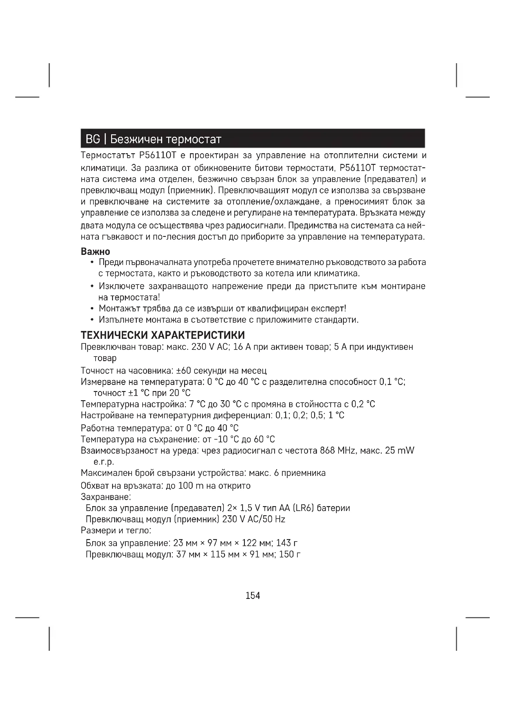 | Технически характеристики | Програмиращ термостат, съвместим с електрически и водни отоплителни системи. |