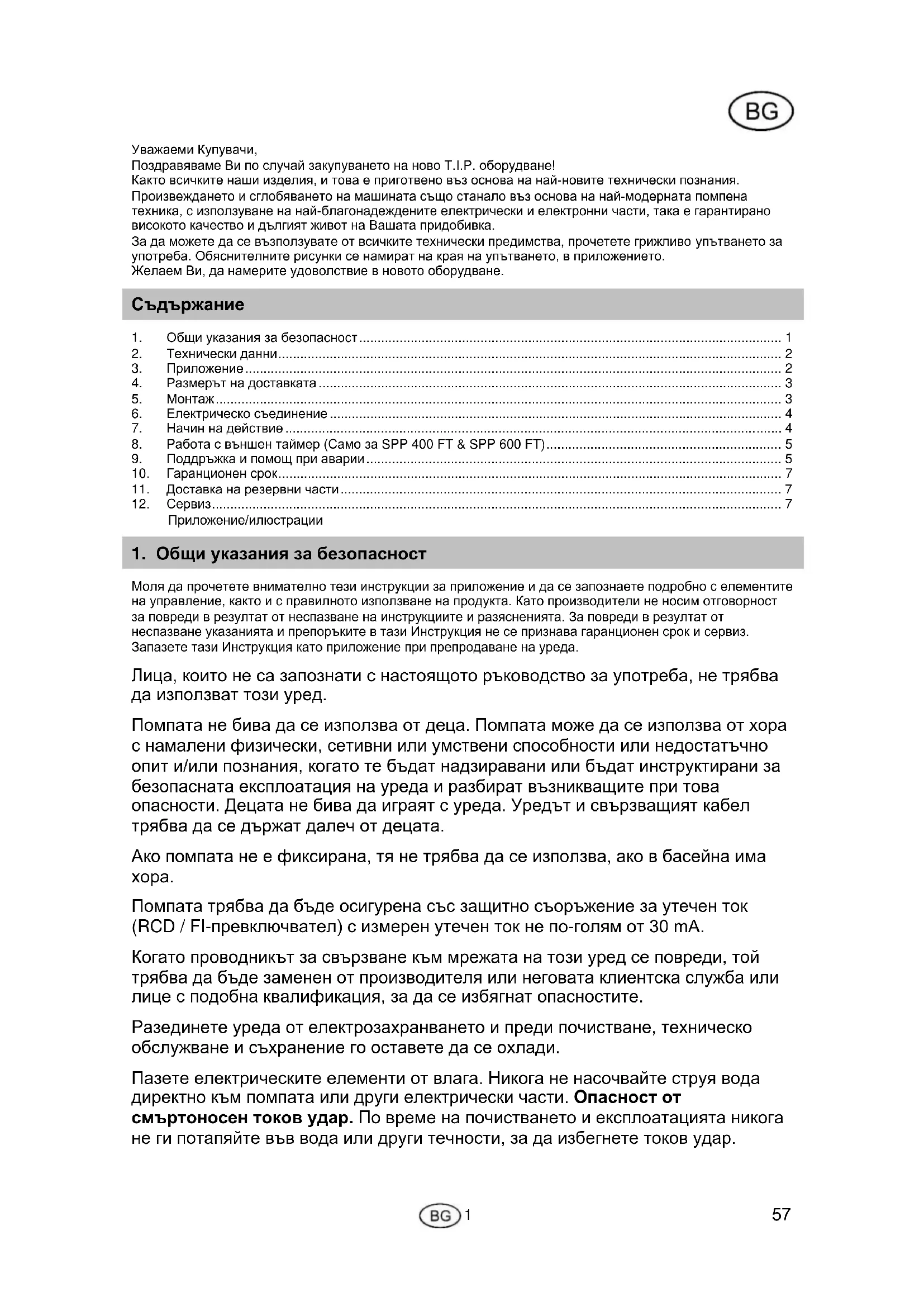 Моля да прочетете внимателно тези инструкции за приложение и да се запознаете подробно с елементите на управление, както и с правилното използване на продукта. Като производители не носим отговорност за повреди в резултат от неспазване на инструкциите и разясненията. За повреди в резултат от неспазване указанията и препоръките в тази Инструкция не се признава гаранционен срок и сервиз. Запазете тази Инструкция като приложение при препродаване на уреда. Лица, които не са запознати с настоящото ръководство за употреба, не трябва да използват този уред. Помпата не бива да се използва от деца. Помпата може да се използва от хора с намалени физически, сетивни или умствени способности или недостатъчно опит и/или познания, когато те бъдат надзиравани или бъдат инструктирани за безопасната експлоатация на уреда и разбират възникващите при това опасности. Децата не бива да играят с уреда. Уредът и свързващият кабел трябва да се държат далеч от децата. Ако помпата не е фиксирана, тя не трябва да се използва, ако в басейна има