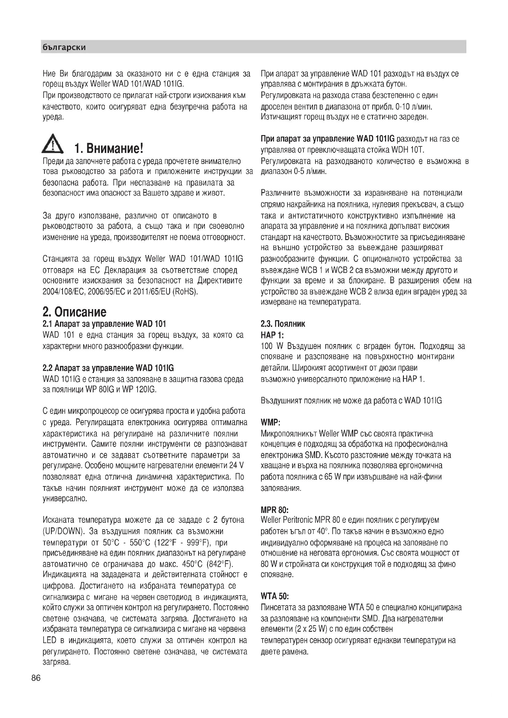 Преди да започнете работа с уреда прочетете внимателно това ръководство за работа и приложените инструкции за безопасна работа. При неспазване на правилата за безопасност има опасност за Вашето здраве и живот. За друго използване, различно от описаното в ръководството за работа, а също така и при своеволно изменение на уреда, производителят не поема отговорност. Станцията за горещ въздух Weller WAD 101/WAD 101IG отговаря на ЕС Декларация за съответствие според основните изисквания за безопасност на Директивите 2004/108/ЕС, 2006/95/EC и 2011/65/ЕU (RoHS).