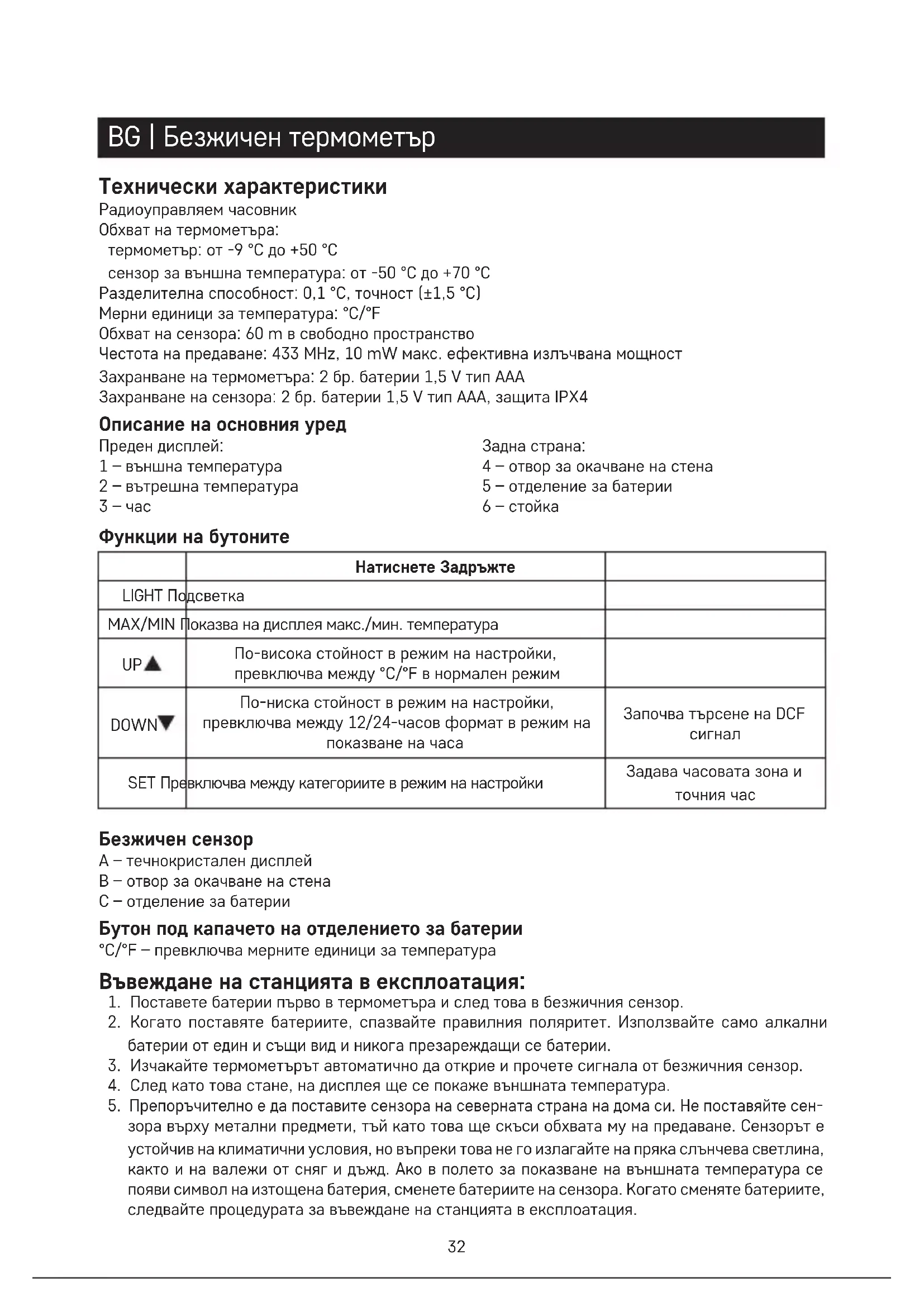 Безжичен сензор A – течнокристален дисплей B – отвор за окачване на стена C – отделение за батерии Бутон под капачето на отделението за батерии °C/°F – превключва мерните единици за температура Въвеждане на станцията в експлоатация: