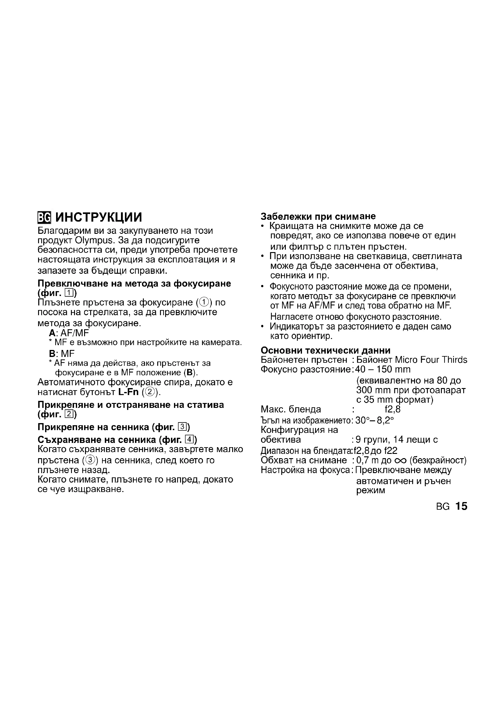 РЪКОВОДСТВО ЗА ПОТРЕБИТЕЛЯ ED 40150mm F2.8 PRO OLYMPUS
