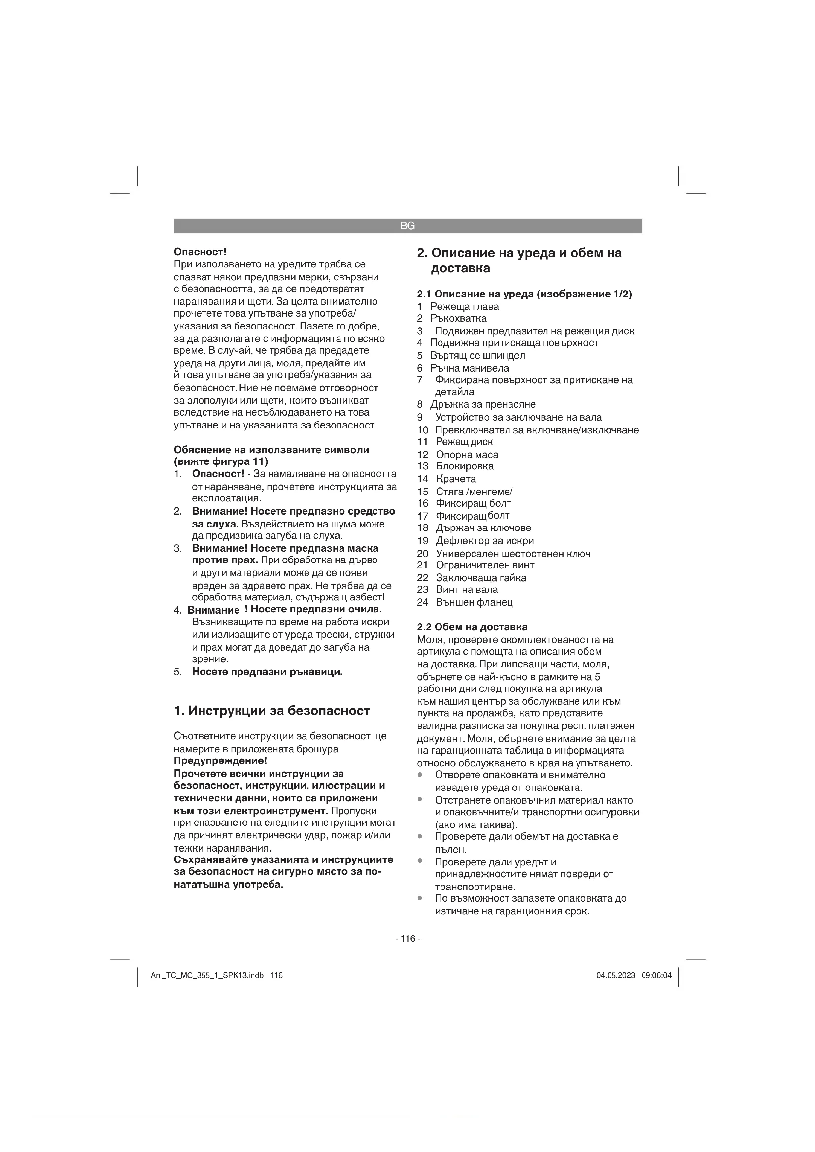 Само за страни от ЕС Не изхвърляйте електроинструментите при битовите отпадъциl! Съгласно Европейската директива 2012/19/ EO за електрически и електронни стари уреди и прилагането в националното право употребените електроинструменти трябва да се събират отделно и да се доставят за екологична повторна употреба. Алтернатива за рециклиране по отношение на призива за връщане: Собственикът на електроуреда вместо връщане алтернативно с цел съдействие е задължен по отношение на целесъобразното оползотворяване в случай на отказ от собственост. Старият уред за целта също така може да се предостави в пункт за обратно вземане, където се извършва отстраняване по смисъла на националните закони за събирането, извозването, складирането и рециклирането на отпадъци. Това не засяга приложените към старите уреди отделни части от принадлежностите и помощни средства без електрически компоненти. Моля, имайте предвид при изхвърлянето, че батериите и осветителните средства (напр. крушки) трябва да са извадени от устройството. Препечатването или друг вид размножаване на документация и съпроводителни документи на продуктите, също така на части е допустимо само с изричното съгласие на Einhell Germany AG /ИСК ГмбХ/. Запазено е правото за извършване на технически промени Anl_TC_MC_355_1_SPK13.indb 121Anl_TC_MC_355_1_SPK13.indb 121 04.05.2023 09:06:0604.05.2023 09:06:06BG