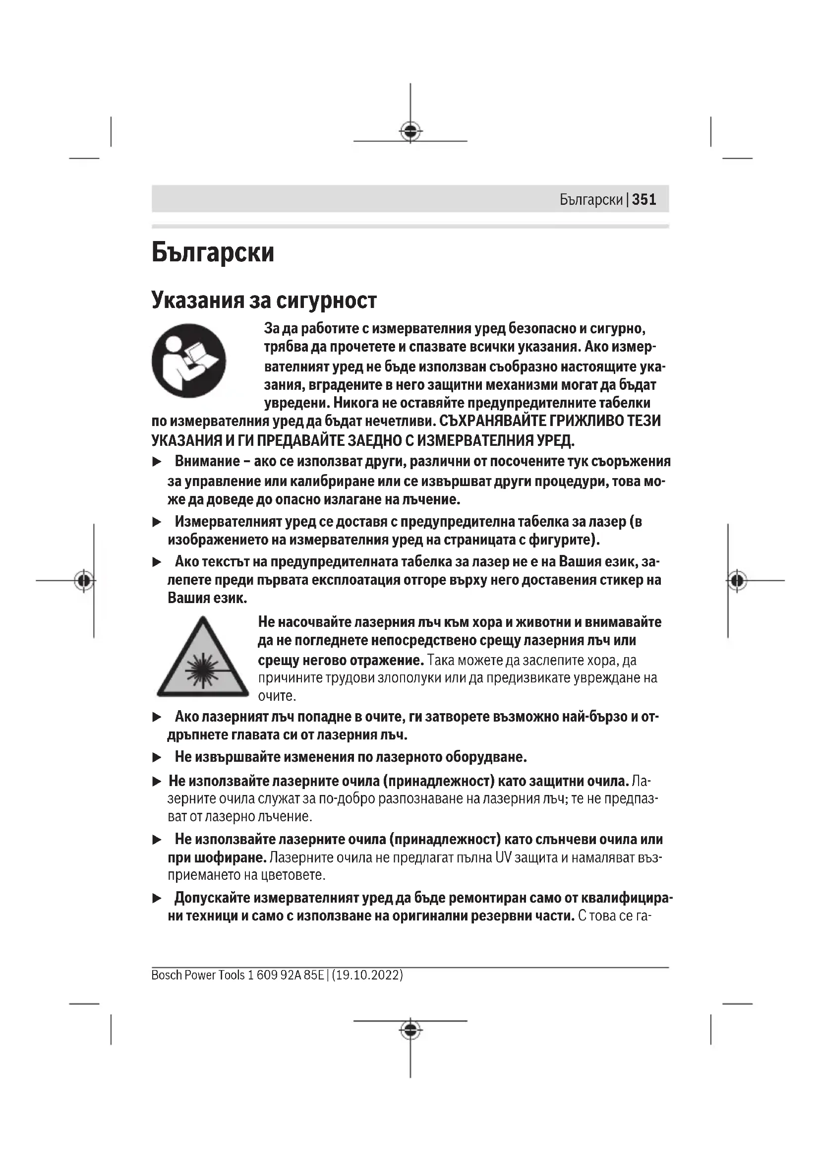 u Ако лазерният лъч попадне в очите, ги затворете възможно най-бързо и от- дръпнете главата си от лазерния лъч. u Не извършвайте изменения по лазерното оборудване. u Не използвайте лазерните очила (принадлежност) като защитни очила. Ла- зерните очила служат за по-добро разпознаване на лазерния лъч; те не предпаз- ват от лазерно лъчение. u Не използвайте лазерните очила (принадлежност) като слънчеви очила или при шофиране. Лазерните очила не предлагат пълна UV защита и намаляват въз- приемането на цветовете. u Допускайте измервателният уред да бъде ремонтиран само от квалифицира- ни техници и само с използване на оригинални резервни части. С това се га- Bosch Power Tools 1 609 92A 85E | (19.10.2022)352 | Български рантира запазването на функциите, осигуряващи безопасността на измервател-
