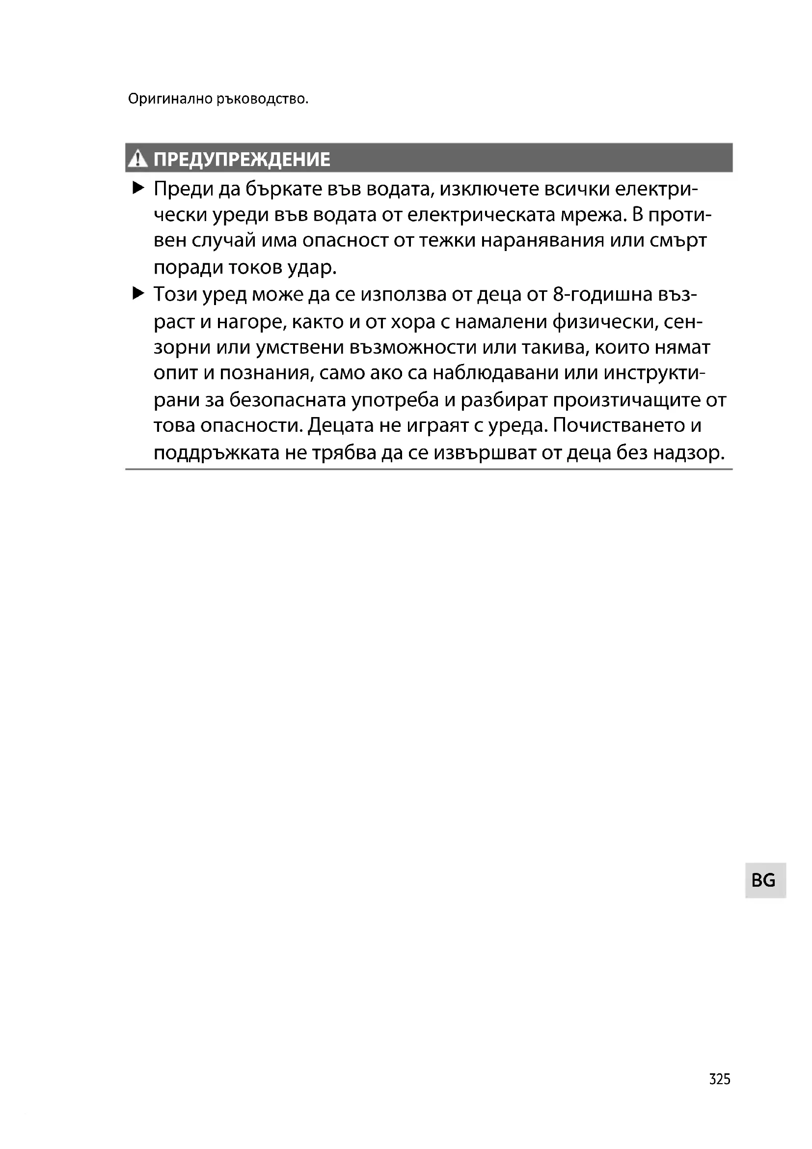 ПРЕДУП РЕЖДЕН ИЕ ПРЕДУПРЕЖДЕНИЕ Преди да бъркате във водата, изключете всички електри- чески уреди във водата от електрическата мрежа. В проти- вен случай има опасност от тежки наранявания или смърт поради токов удар. Този уред може да се използва от деца от 8-годишна въз- раст и нагоре, както и от хора с намалени физически, сен- зорни или умствени възможности или такива, които нямат опит и познания, само ако са наблюдавани или инструкти- рани за безопасната употреба и разбират произтичащите от това опасности. Децата не играят с уреда. Почистването и поддръжката не трябва да се извършват от деца без надзор.326 Указания за безопасност Електрическа връзка