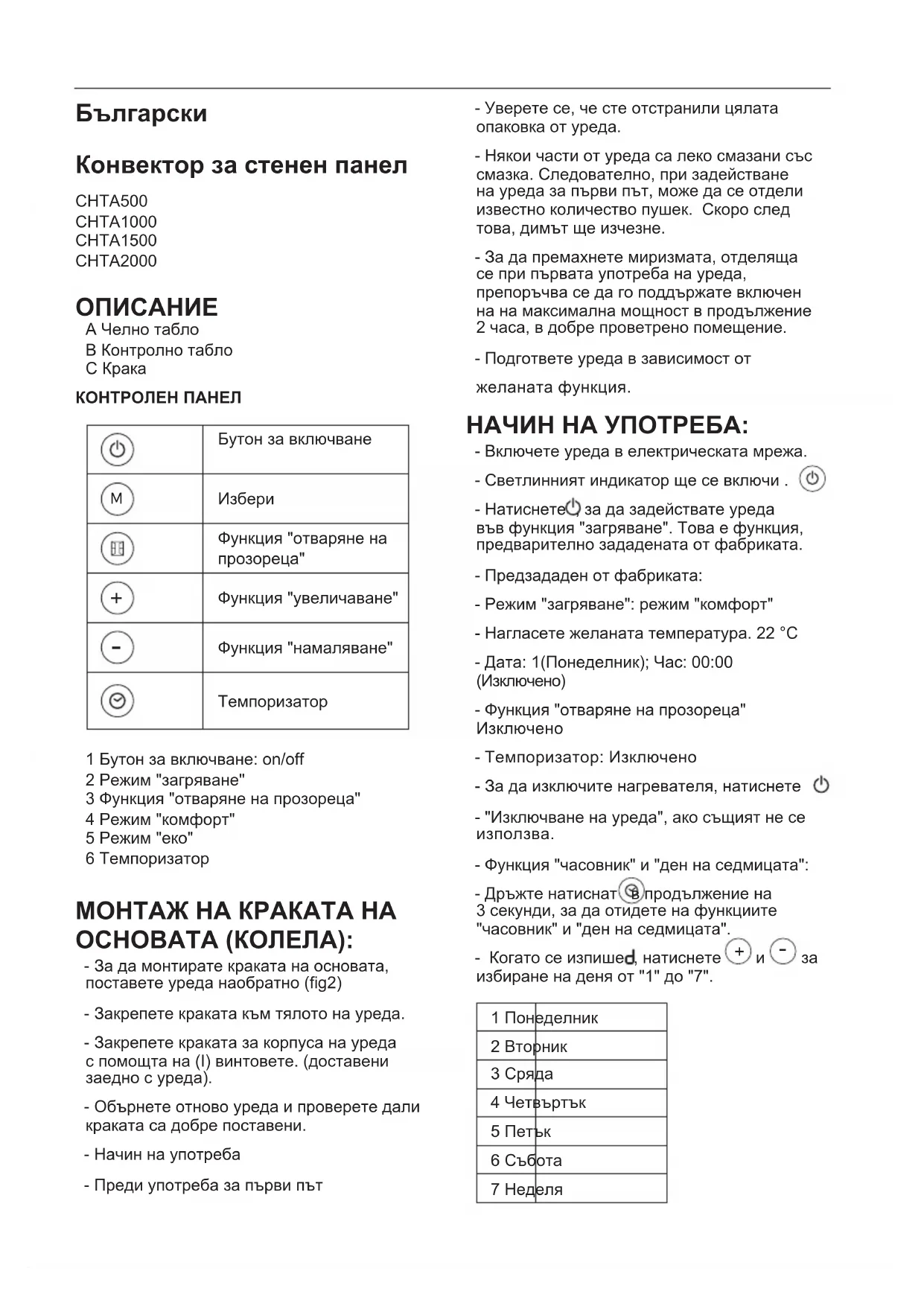 Функция "намаляване" Темпоризатор 1 Бутон за включване: on/off 2 Режим "загряване" 3 Функция "отваряне на прозореца" 4 Режим "комфорт" 5 Режим "еко" 6 Темпоризатор МОНТАЖ НА КРАКАТА НА ОСНОВАТА (КОЛЕЛА): - За да монтирате краката на основата, поставете уреда наобратно (g2) - Закрепете краката към тялото на уреда. - Закрепете краката за корпуса на уреда с помощта на (I) винтовете. (доставени заедно с уреда). - Обърнете отново уреда и проверете дали краката са добре поставени. - Начин на употреба - Преди употреба за първи път - Уверете се, че сте отстранили цялата опаковка от уреда. - Някои части от уреда са леко смазани със смазка. Следователно, при задействане на уреда за първи път, може да се отдели известно количество пушек. Скоро след това, димът ще изчезне. - За да премахнете миризмата, отделяща се при първата употреба на уреда, препоръчва се да го поддържате включен на на максимална мощност в продължение 2 часа, в добре проветрено помещение. - Подгответе уреда в зависимост от желаната функция. НАЧИН НА УПОТРЕБА: - Включете уреда в електрическата мрежа. - Светлинният индикатор ще се включи . - Натиснете , за да задействате уреда във функция "загряване". Това е функция, предварително зададената от фабриката. - Предзададен от фабриката: - Режим "загряване": режим "комфорт" - Нагласете желаната температура. 22 °C - Дата: 1(Понеделник); Час: 00:00 (Изключено) - Функция "отваряне на прозореца"