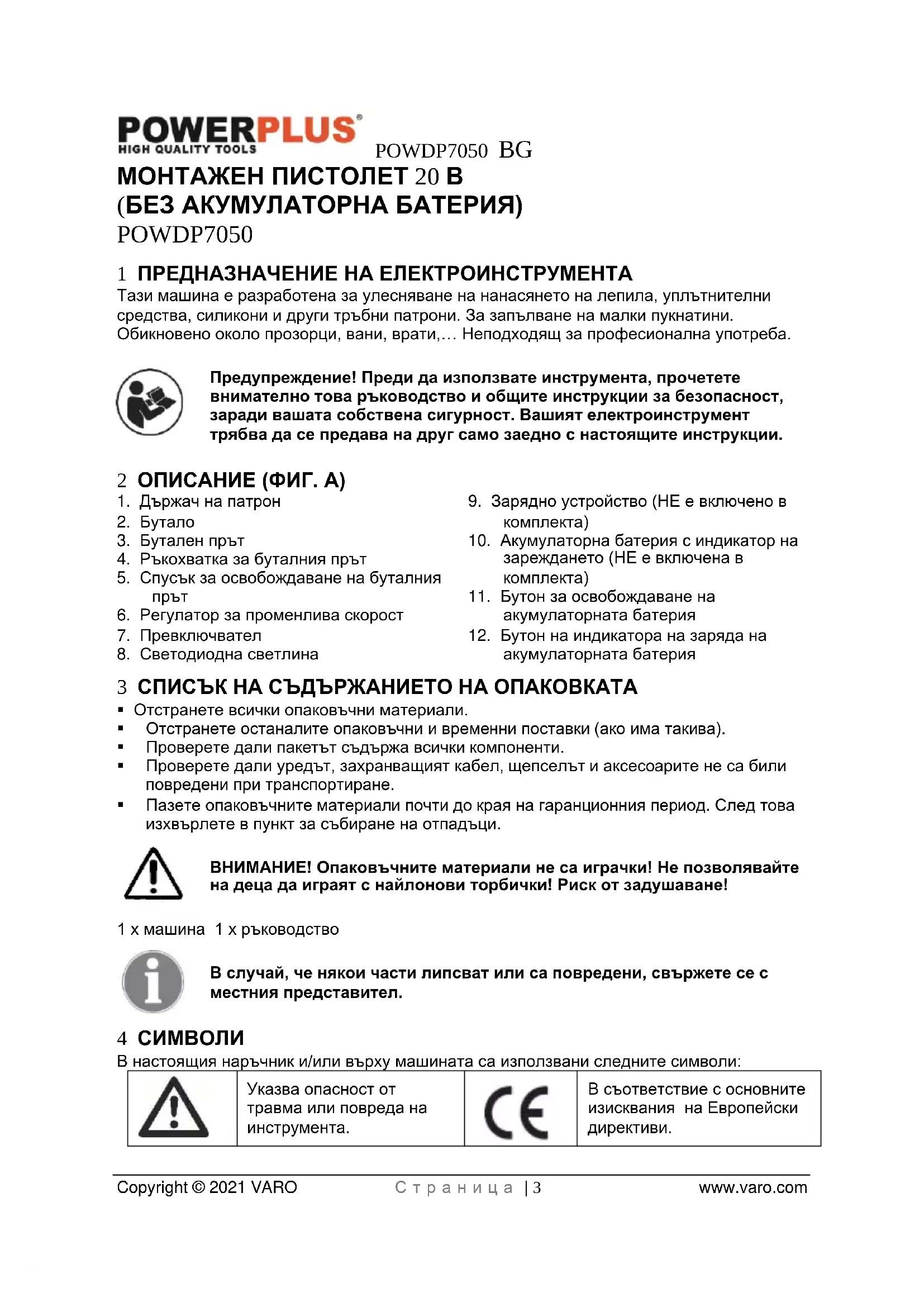 - POWDP7050 BG Copyright © 2021 VARO С т р а н и ц а | 2 www.varo.com 13 ДЕКЛАРАЦИЯ ЗА СЪОТВЕТСТВИЕ POWDP7050 BG Copyright © 2021 VARO С т р а н и ц а | 3 www.varo.com МОНТАЖЕН ПИСТОЛЕТ 20 В (БЕЗ АКУМУЛАТОРНА БАТЕРИЯ) POWDP7050 1 ПРЕДНАЗНАЧЕНИЕ НА ЕЛЕКТРОИНСТРУМЕНТА Тази машина е разработена за улесняване на нанасянето на лепила, уплътнителни средства, силикони и други тръбни патрони. За запълване на малки пукнатини. Обикновено около прозорци, вани, врати,… Неподходящ за професионална употреба. Предупреждение! Преди да използвате инструмента, прочетете внимателно това ръководство и общите инструкции за безопасност, заради вашата собствена сигурност. Вашият електроинструмент трябва да се предава на друг само заедно с настоящите инструкции. 2 ОПИСАНИЕ (ФИГ. A) p. 11