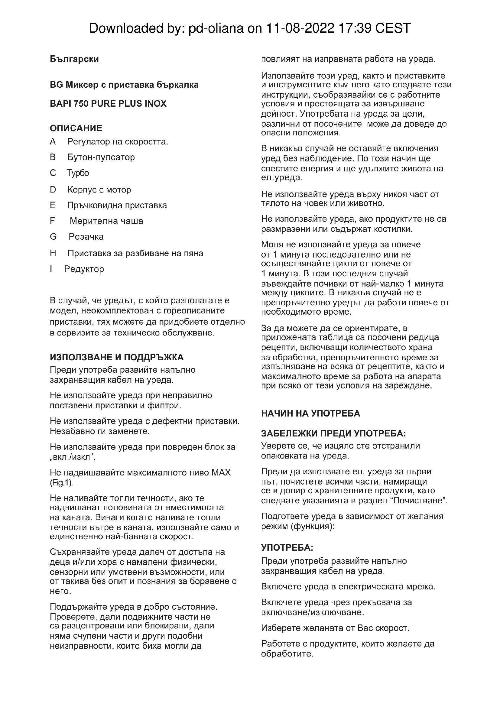 Bapi 750 Pure Plus Inox - Ръчен блендер TAURUS - Безплатно ръководство за потребителя