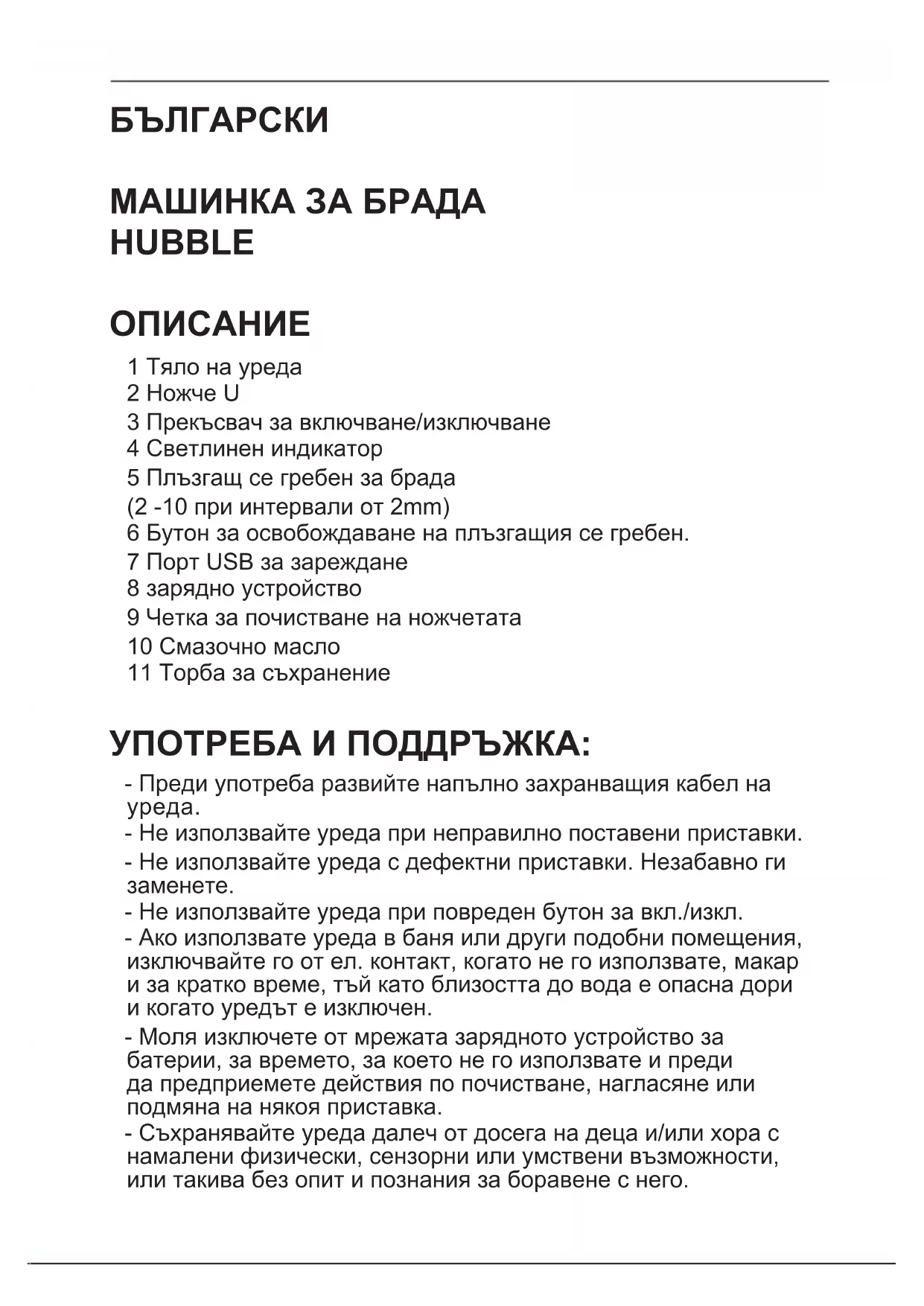 1 Тяло на уреда 2 Ножче U 3 Прекъсвач за включване/изключване 4 Светлинен индикатор 5 Плъзгащ се гребен за брада (2 -10 при интервали от 2mm) 6 Бутон за освобождаване на плъзгащия се гребен. 7 Порт USB за зареждане 8 зарядно устройство 9 Четка за почистване на ножчетата 10 Смазочно масло 11 Торба за съхранение УПОТРЕБА И ПОДДРЪЖКА: - Преди употреба развийте напълно захранващия кабел на