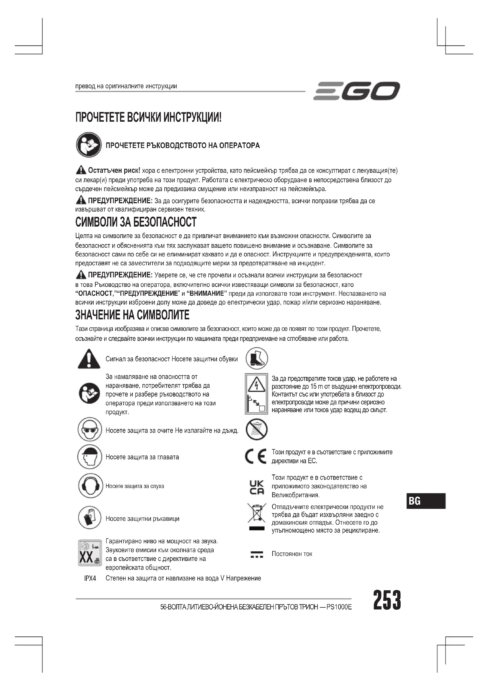 ПРОЧЕТЕТЕ ВСИЧКИ ИНСТРУКЦИИ! ПРОЧЕТЕТЕ РЪКОВОДСТВОТО НА ОПЕРАТОРА Остатъчен риск! хора с електронни устройства, като пейсмейкър трябва да се консултират с лекуващия(те) си лекар(и) преди употреба на този продукт. Работата с електрическо оборудване в непосредствена близост до сърдечен пейсмейкър може да предизвика смущение или неизправност на пейсмейкъра. ПРЕДУПРЕЖДЕНИЕ: За да осигурите безопасността и надеждността, всички поправки трябва да се извършват от квалифициран сервизен техник. СИМВОЛИ ЗА БЕЗОПАСНОСТ Целта на символите за безопасност е да привличат вниманието към възможни опасности. Символите за безопасност и обясненията към тях заслужават вашето повишено внимание и осъзнаване. Символите за безопасност сами по себе си не елиминират каквато и да е опасност. Инструкциите и предупрежденията, които предоставят не са заместители за подходящите мерки за предотвратяване на инцидент. ПРЕДУПРЕЖДЕНИЕ: Уверете се, че сте прочели и осъзнали всички инструкции за безопасност в това Ръководство на оператора, включително всички известяващи символи за безопасност, като “ОПАСНОСТ,”“ПРЕДУПРЕЖДЕНИЕ” и “ВНИМАНИЕ” преди да използвате този инструмент. Неспазването на всички инструкции изброени долу може да доведе до електрически удар, пожар и/или сериозно нараняване. ЗНАЧЕНИЕ НА СИМВОЛИТЕ Тази страница изобразява и описва символите за безопасност, които може да се появят по този продукт. Прочетете, осъзнайте и следвайте всички инструкции по машината преди предприемане на сглобяване или работа. Сигнал за безопасност Носете защитни обувкиЗа намаляване на опасността от нараняване, потребителят трябва да прочете и разбере ръководството на оператора преди използването на този продукт.За да предотвратите токов удар, не работете на разстояние до 15 m от въздушни електропроводи. Контактът със или употребата в близост до електропроводи може да причини сериозно нараняване или токов удар водещ до смърт.Носете защита за очите Не излагайте на дъжд.Носете защита за главатаТози продукт е в съответствие с приложимите директиви на ЕС.Носете защита за слухаТози продукт е в съответствие с приложимото законодателство на Великобритания.Носете защитни ръкавициОтпадъчните електрически продукти не трябва да бъдат изхвърляни заедно с домакинския отпадък. Отнесете го до упълномощено място за рециклиране.