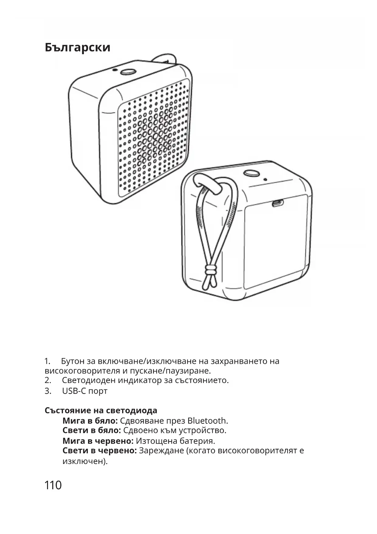 Състояниенасветодиода Мигавбяло:СдвояванепрезBluetooth. Светивбяло:Сдвоенокъмустройство. Мигавчервено:Изтощенабатерия. Светивчервено:Зареждане(когатовисокоговорителяте